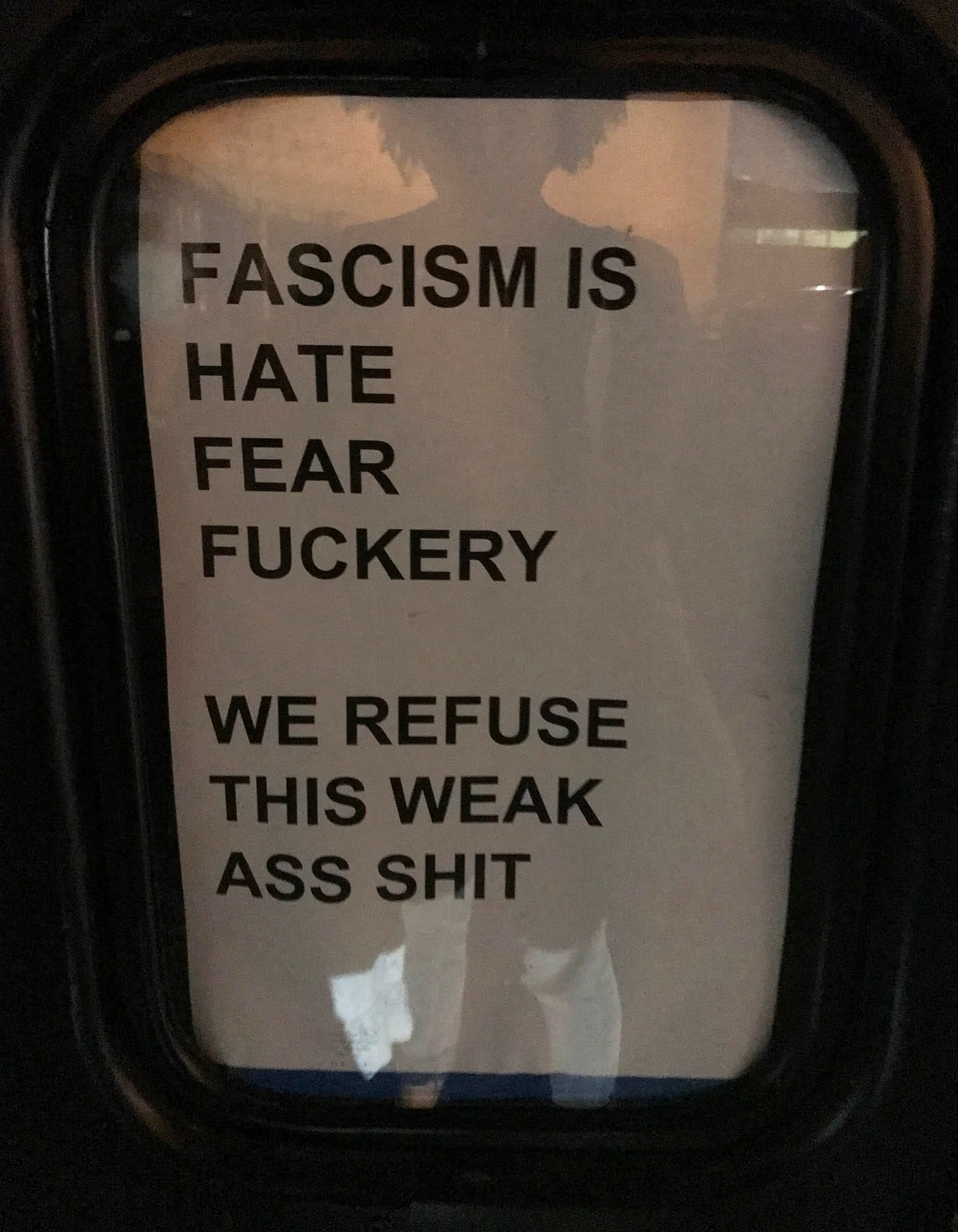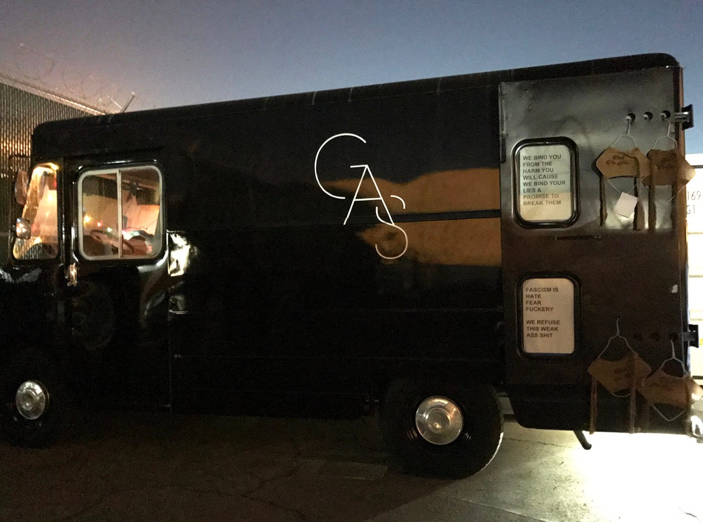 From the outside, the small black truck decked out in protest signage looks like it could blend inconspicuously into the traffic of any left-leaning metropolis. The front windows are covered by Paul Chan and Badlands Unlimited’s “New Proverbs,” appropriated Westboro Baptist church posters that are staunchly, comically anti-Trump. On the back door and windows hang excerpts from YERBAMALA COLLECTIVE’s anonymous, author-less zine, Our Vendetta: Witches vs Fascists. One sign bluntly reads, “FASCISM IS HATE FEAR FUCKERY / WE REFUSE THIS WEAK ASS SHIT,” rendered in the collective’s signature large, all-caps, black Arial typeface.