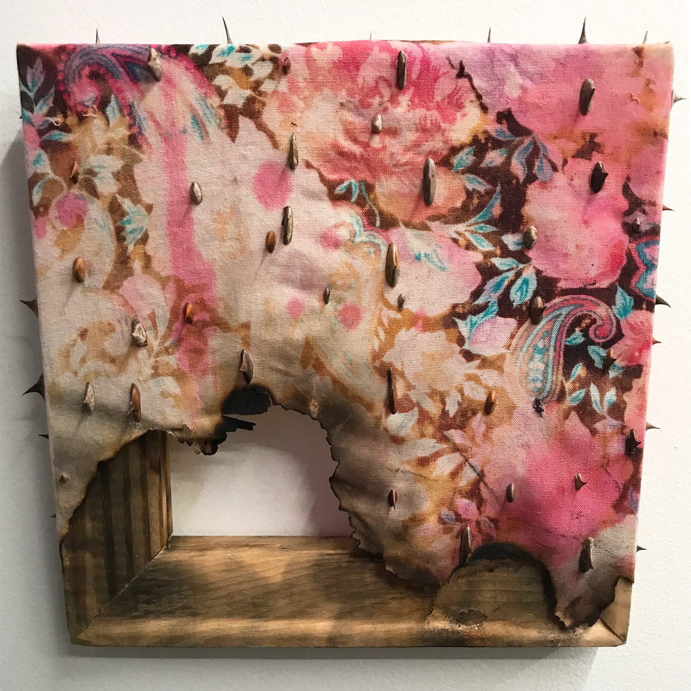 Further in are Angélica Maria Millán Lozano’s Espinas, distressed fabrics reinforced with rose thorns that represent a similar sentiment of defiance by Latina women. The thorns, unlike the roses from which they came, remain taut, prickly, ready to nip at your skin. Both Satlowski’s and Lozano’s works serve as a reminder of the ever-present threat of patriarchal aggression and, moreover, as a warning to those who may try to hurt us. We artist and activists, the sculptures seem to say, will fight back.