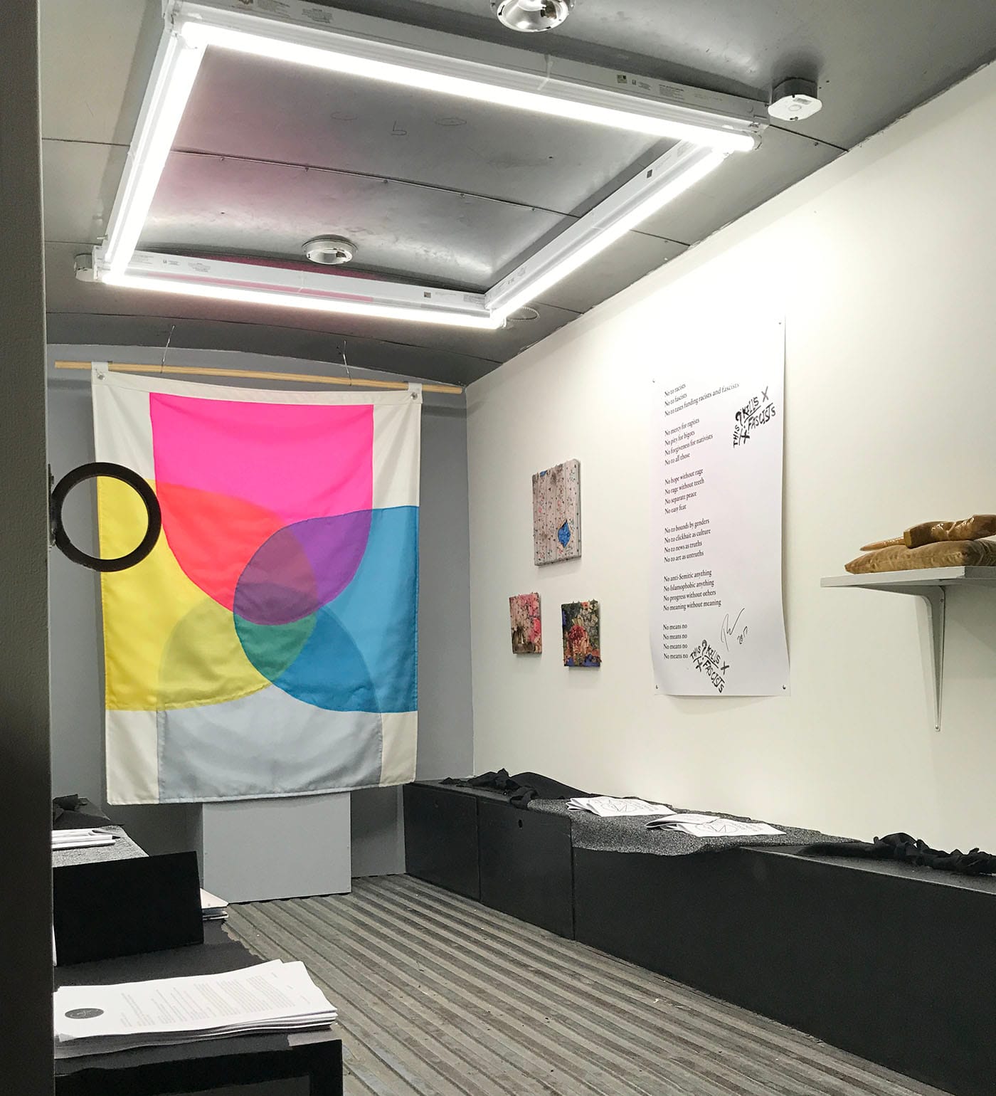 Almost all of the works in Fuck the Patriarchy — from stockings by Hanan Sharifa that read “Trust No Man” and hang from the truck’s door and the colorful, interlocking circles on Cristina Victor’s “100 Days of Action Resistance Flag,” to the fabrics, lights, zine, dagger, and clownish antifa makeup tutorials — are objects that, in some sense, amount to a political life and body. Together, these works have the capacity to nourish and arm us against the current political regime.