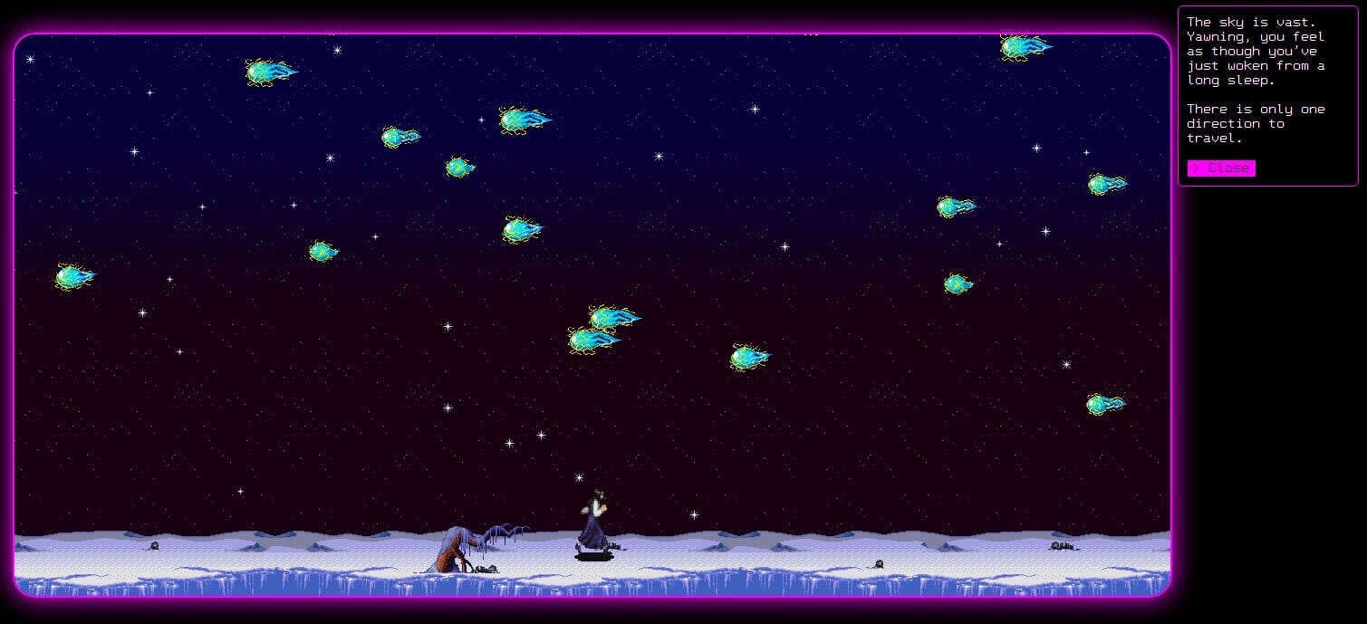 Created and developed by Cassie McQuater, Black Room is free to play (with the option to donate money), and was “conceived as a feminist dungeon crawler, [and] features a majority female cast of video game sprites from the 1970s–current day.” After the game’s opening sequence — a blue light descends through a heron-filled sky before crashing to the ground and turning into a woman — my fingers are only allowed to do one thing: move my character to the right. As I do, the background comes alive with stars and fantastical birds. I’m moving through this dreamscape, alone. When I click on the “?” in the upper-right corner of the screen, I’m told, “The sky is vast. Yawning, you feel as though you’ve just woken from a long sleep. There is only one direction to travel.” Onward it is.