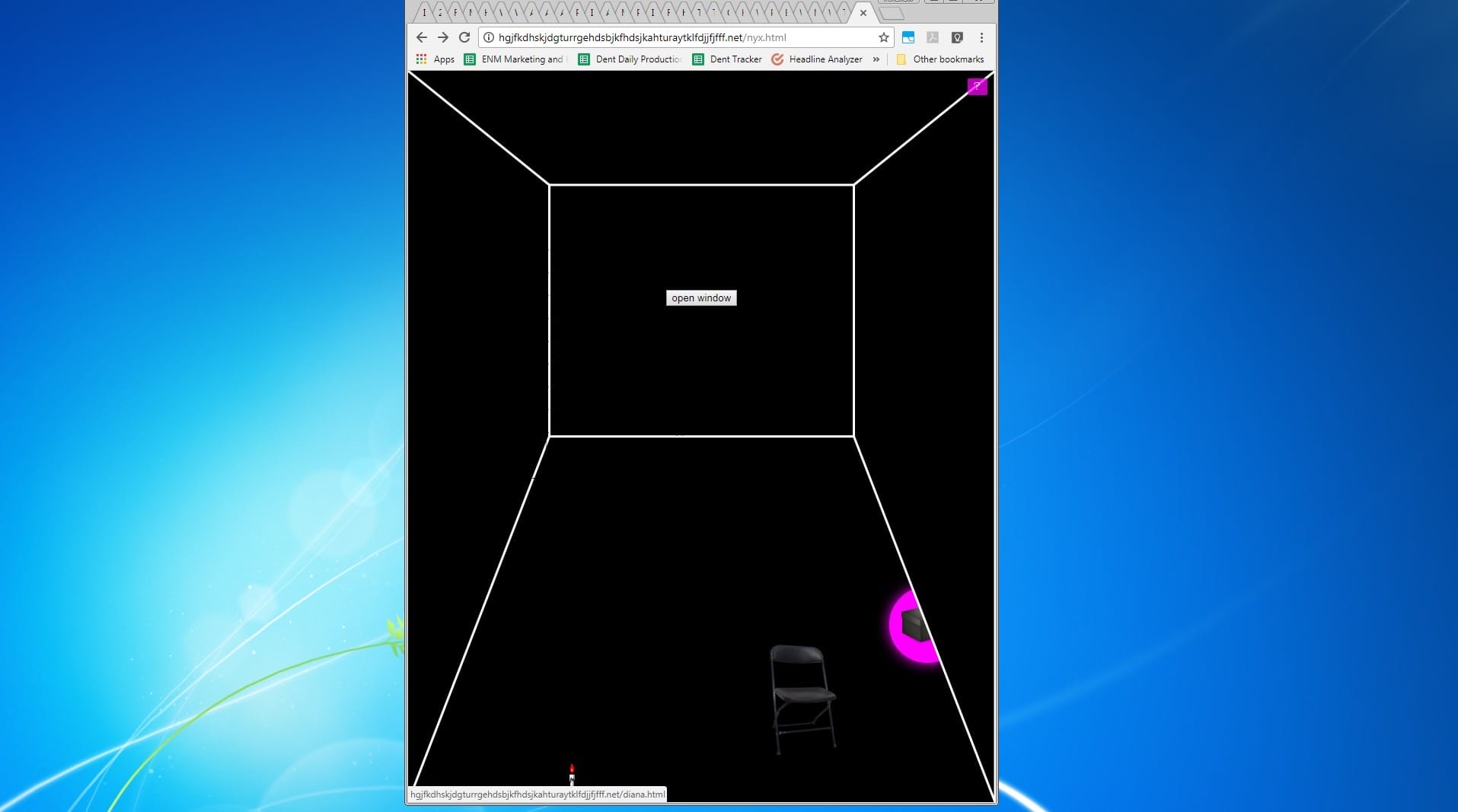The screen goes black, with a room outlined in white, a chair in one corner and a candle in another. The scant instructions remind me that I’m supposed to resize my browser in order to find hidden objects. It takes me a little while to realize that “resize my browser” means clicking and dragging around a corner of the window, contorting it (and my many, far too many, tabs).