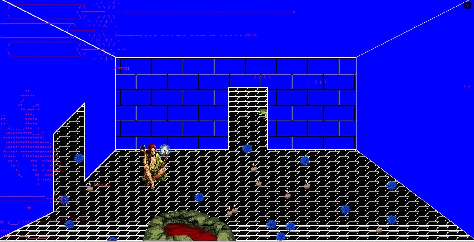 Room after room, the dream state deepens. Sometimes text pops up when you hover over an object (“In the corner sits an odd, dark creature with medusa-like vines emanating from its head.”) There is a childlike sense of adventure going into each room, and a vaguely disconcerting feeling as well. You don’t know which object will take you into another browser, another collaged landscape of retro video game figures. Resizing the browser becomes a gesture that makes the game itself seem like a piece of paper, or a veil of consciousness.