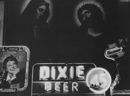 “The Dixie Madonna, a fortuitous arrangement of the religious and the brazenly secular, depicts within one limited shop window tableau all that needs to be known about New Orleans Catholicism. Behind the fashionable forties miss and the symbolically bulky Jack Falstaff, rise in a velvety Veronica’s veil of perpetual grief both the Man of Sorrows and the Mater Dolorosa. And of course this is exactly how it is: in the background, a spiritual mist crowded with figures of pain and redemption, and in the foreground, bright lights and Dixie on tap.”
