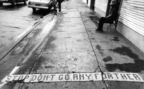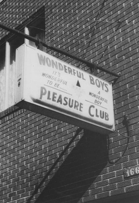 “In perfect counterpoint and equipoise, on a severe plain black facade, the sign for the Wonderful Boys Pleasure Club promises cackles, smirks, a prankish sort of mirth and hints as well at riotous jocundity. But against this changeless and unchangeable wall, with no structural variations, this invitation to semi-Masonic jollities looks chilling. What goes on inside this building?”
