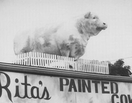 “This mauve bovine with floral patterns kept watch, as did the animal god-guardians of Egypt, over the ant-like chaos of Franklin Avenue. Was it only painted and stationary? Look again at that cloven hoof protruding through the pickets of its diminutive fence and wonder why that creature is no longer on its perch and where it can be running riot now—perhaps carrying some gum-chewing Europa off the shores of Lake Pontchartrain at this instant.”