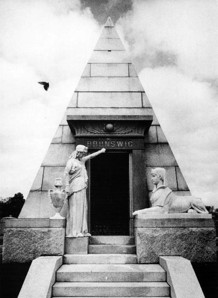 “Appropriately enough, the finest Egyptiana is reserved for the local necropoli—New Orleans and the Nile Valley are both centers of a death cult that is immensely and carefully theatrical in its expression … A gentleman with the most un-pharaonic name of Lucien Brunswig is honored in Metairie Cemetery by a sepulcher in the form of a pyramid, by the doors of which couches a suitably dour sphinx while, on the other side, a gowned Ptolemaic figure raises a hand in perpetual grief.”