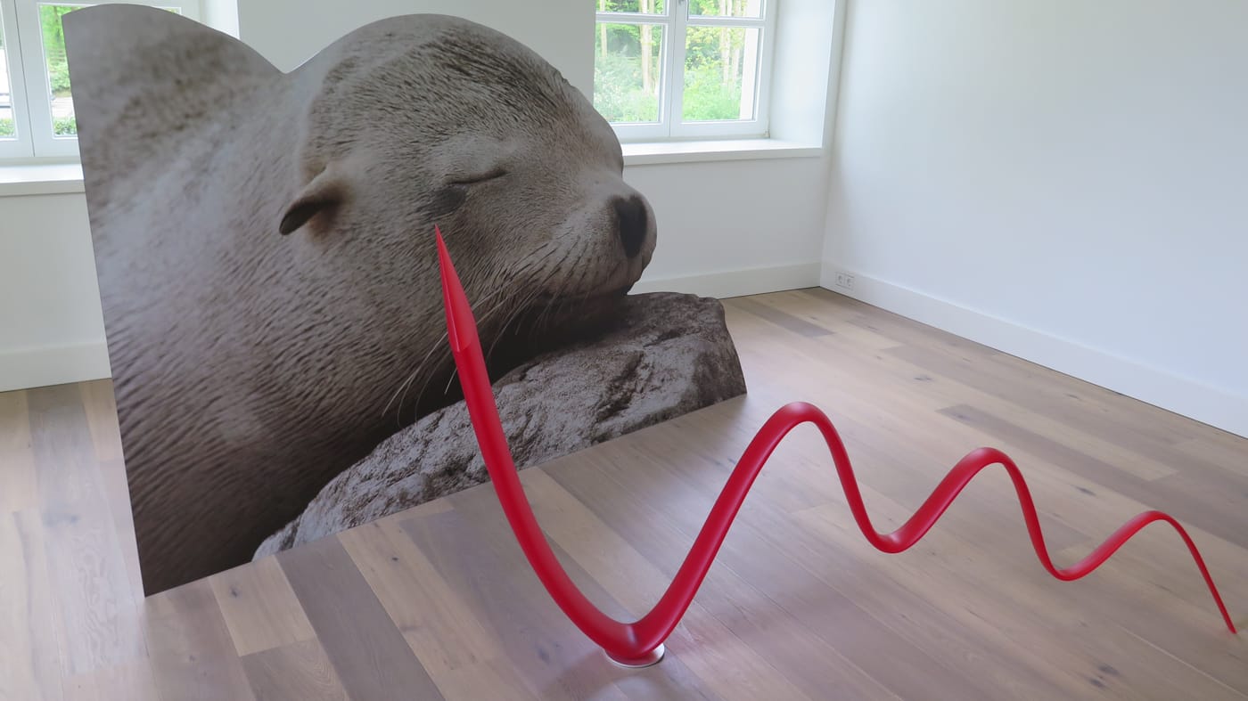 Passing through the main entrance the strangeness continues. On the ground floor Andreas Slominski mixes pieces of coffins and cribs with quotidian Bauhaus furniture. Ed Atkins‘s video, “Hisser” (2015), a surreal narrative film shot in the style of David Lynch, is projected onto a double screen. Katja Novitskova‘s installation, “Pattern of Activation (sea lion)” (2015), surprises with a touch of cuteness: a large sandwich-board print of a napping sea lion, seeming to smile while he rests. But the tenderness is quickly lost in the realization that the animal sleeps beside an ominous red, fiberglass graph line rendered in 3D, and pointing toward an unknown exponential increase which seems related to humanity’s destructive impact on the natural world.
