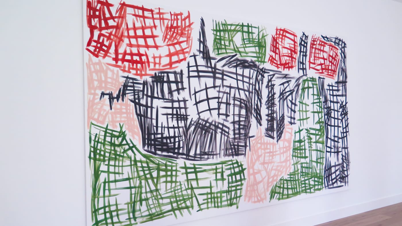 Then the exhibition takes a turn toward the obsessive in a little nook taken up by the desk of Beutler — the autistic 80-year-old Berliner mentioned above. Everything is covered with relentless hatch marking, conveying a sense of paranoia and desperation within the enclosed space. Beutler’s marks are echoed in large paintings by André Butzer and Günther Förg, also containing their own hash mark gestures.