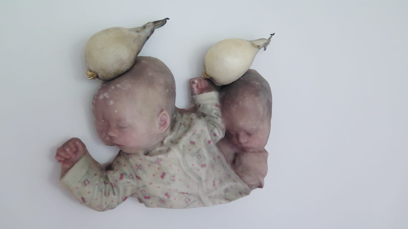 Upstairs is also infested with Frankensteinian animals: Stefano Cagol‘s video, “Stars & Stripes. Redouble” (2013), mimics the flapping wings of an eagle with the mirrored image of an American flag fluttering in the breeze, creating an ever changing Rorschach inkblot. In a small room off to the side, the windows are flung open, but a brick wall blocks the view of the green park below. The bricks are made out of baked birdseed and sugar grouting, and little beaks peck at the untitled artwork by Björn Braun from outside, eating their way into the exhibition. This whimsical performance by birds also embodies the struggle between humans and the natural world that the curator built into the show.