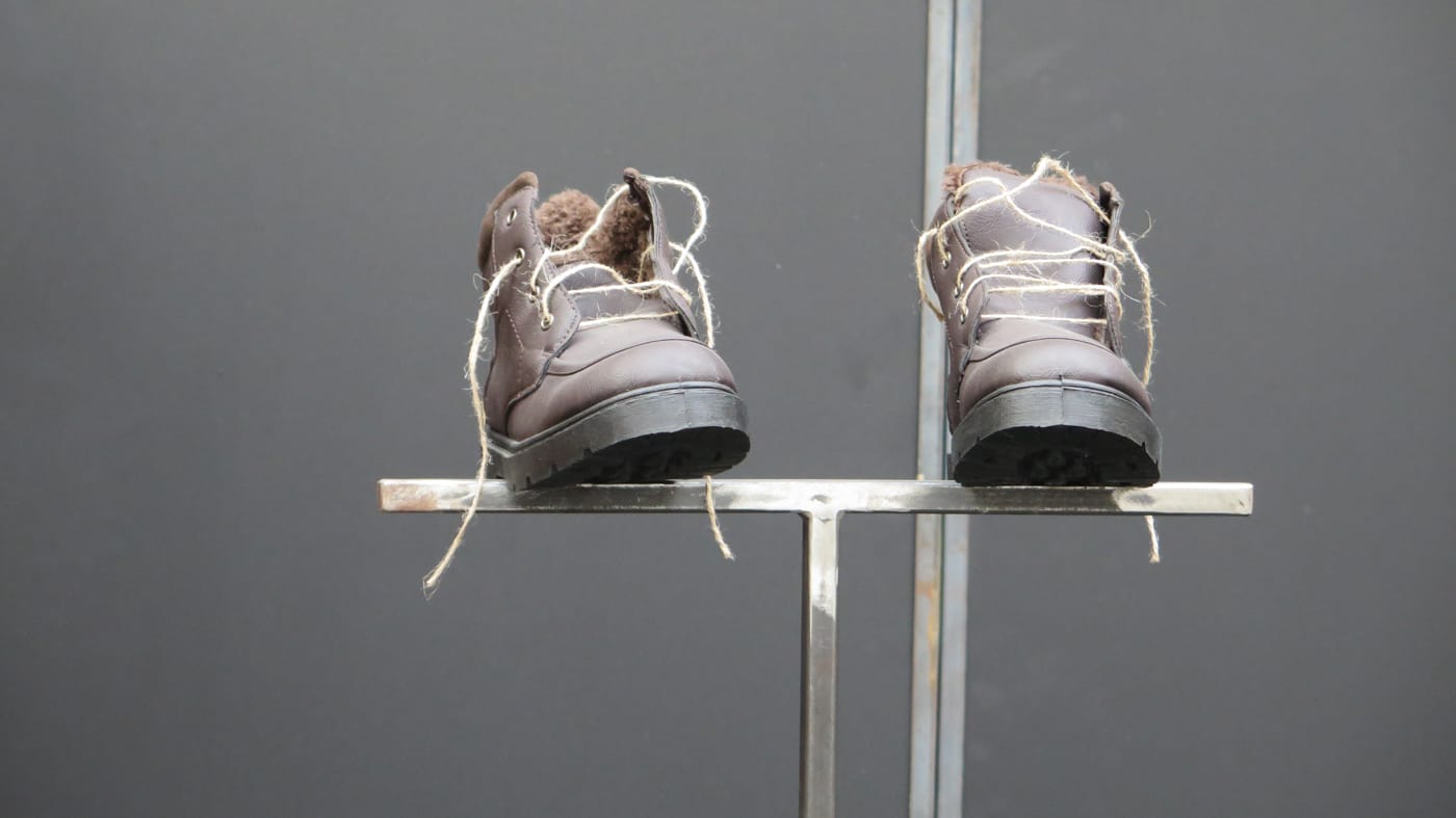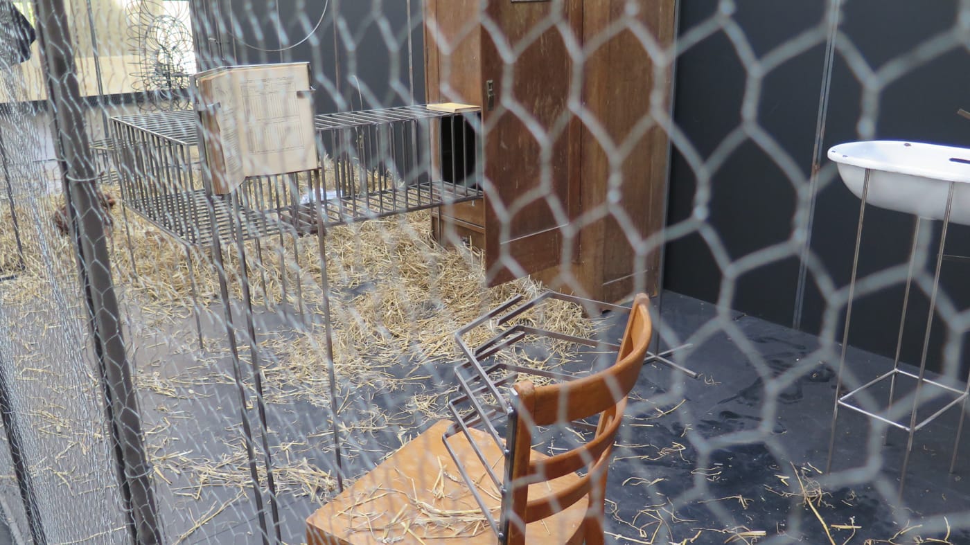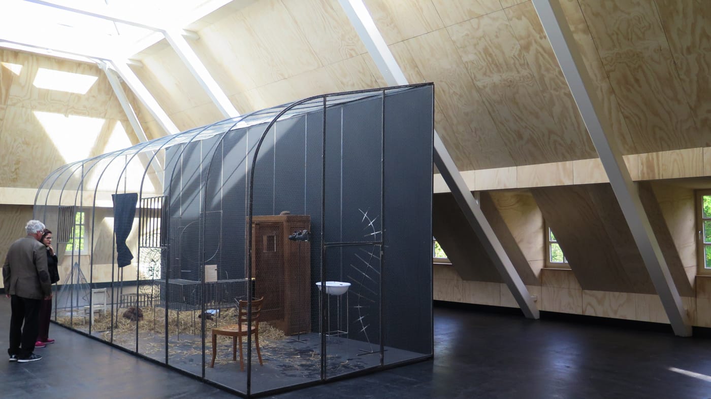 Ascending toward the attic, with the mood set by the second floor, I was almost apprehensive to see what came next. Whatever was hiding in the attic, I had the sense that it wouldn’t be friendly. Here, in the loftiest space in the house, a cage by Eva Kot’átková, “Work of Nature” (2013), is at once a stage for performance and a torture chamber for naughty children. It’s unclear whether the objects inside the human-sized metal enclosure are playthings or weapons. But nothing is straightforward here. The cage is full of mystery, as are most of other works in Lodgers.