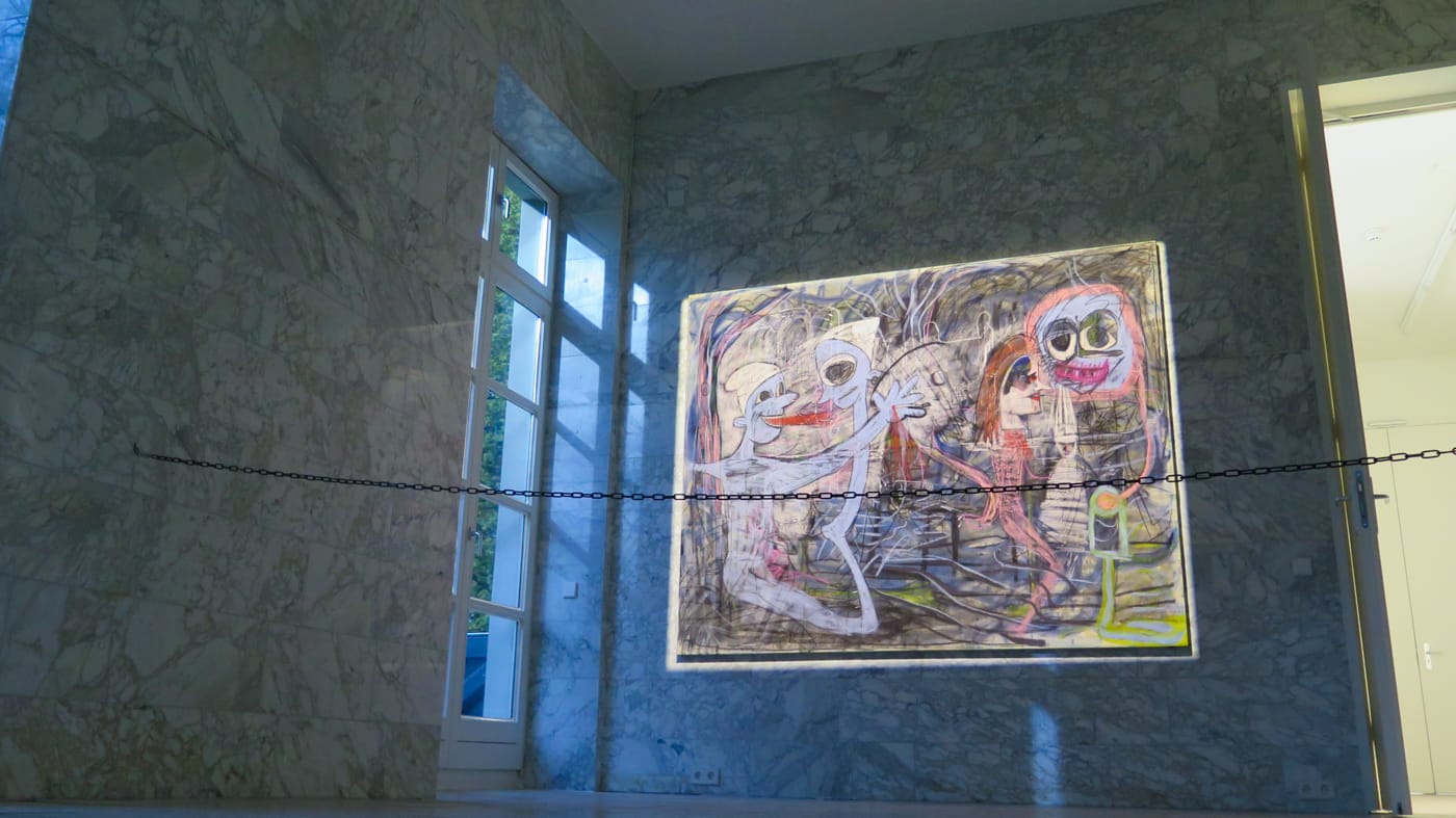 The cuteness has certainly fled, as I notice, before heading upstairs, an entire room off the entrance, containing an elegant marble swimming pool. (Whose ridiculous idea was it to build a swimming pool attached to the foyer?) In an installation by Neïl Beloufa, “The analysts, the researcher, the screenwriter, the CGI tech and the lawyer in a swimming pool” (2017), the pool has been converted into a sort of passageway where projections and disembodied audio bathe the space in colored light. One of my favorite works in the show hangs here: a large painting by Ali Altin, “Mission Blue” (2016), mounted on the grey marble wall and illuminated by a single spotlight. In the darkness of the room the fantastic image seems to float in space and the cartoonish characters come to life — with killer Smurfs.