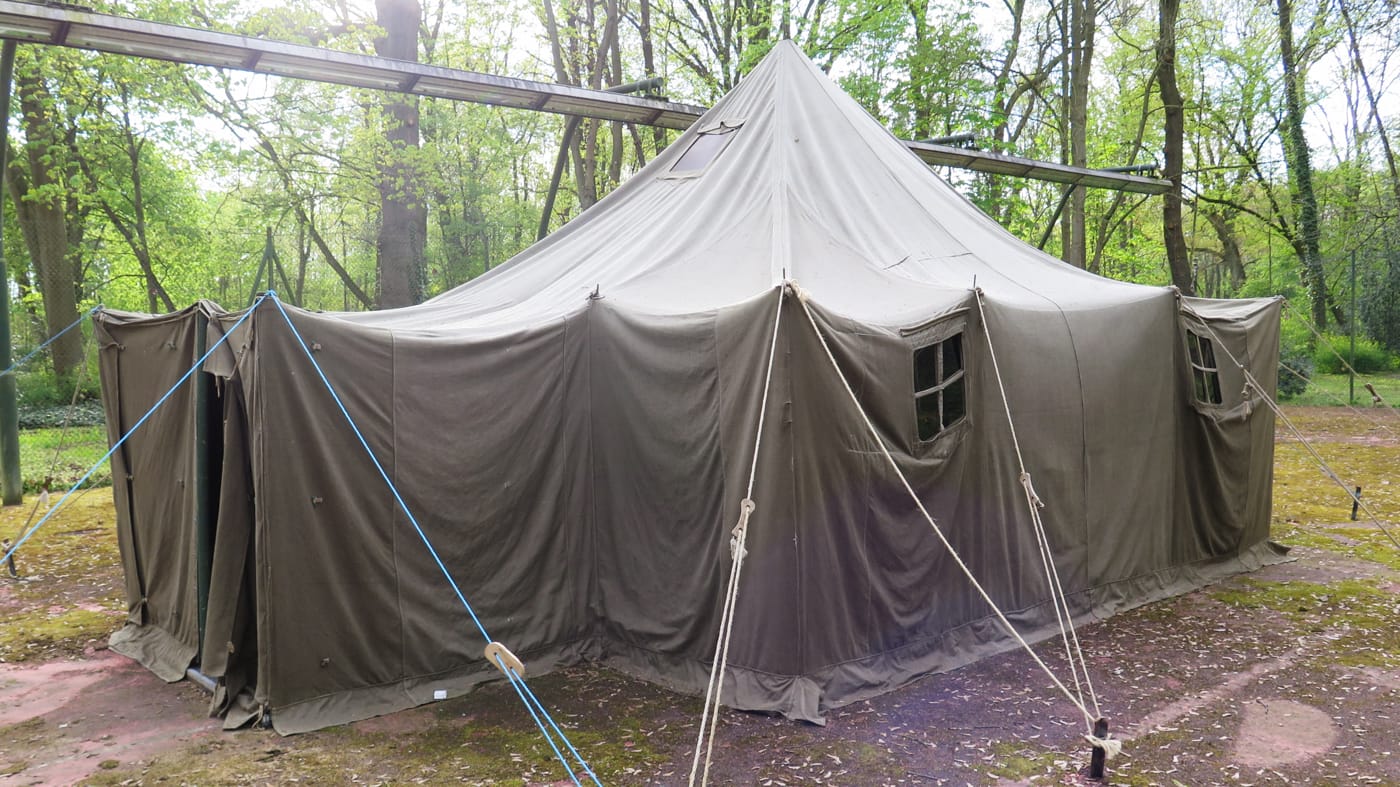 Despite the idyllic setting, the work turns dark before I even enter the building. Two pieces in a run-down tennis court behind the main house create a gloomy mood that carries through the exhibition. A work by Thomas Zipp, “Head Office” (2010), harkens back to wartime, and inside the army tent that frames the piece there’s a scene of debauchery: Alcohol and mysterious powders are scattered around the space where the artist created a performance for the exhibition inauguration on April 23. Ajay Kurian‘s installation, “God’s Wisdom” (2016), inside the ball house a few steps away, is even more harrowing than Zipp’s nod to the ridiculousness of war. Looking into the small structure from outside through windows tinted pink, a horrible image of a decaying Christ seems to be devoured by a humanoid robot. The apocalyptic scene is somehow humorous and cartoonish even while inviting terror into my heart.