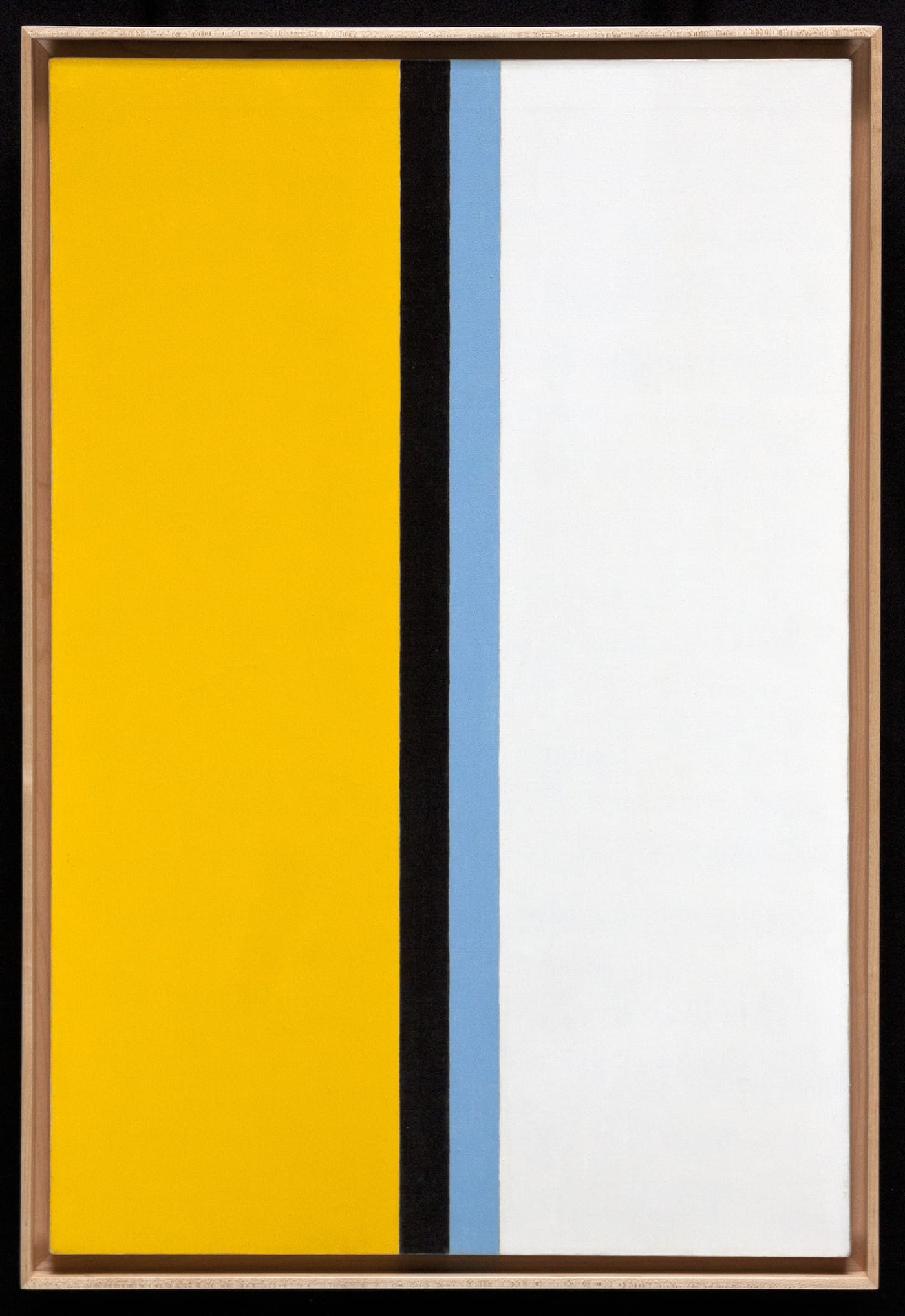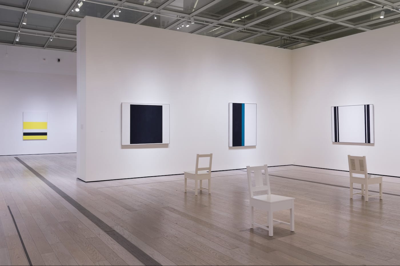 To view a work such as #15-1958 or to simply enter rooms of the exhibition is awe-inspiring. Each painting demands time and contemplation. As McLaughlin argued, “‘Art’ then is not in the canvas but in the mind of the beholder.” Through these luminous images in space, we are not encouraged to imagine the artist’s own personal feelings or struggles in creating his art, but are asked to look within, to find our own feelings in connection with the bands of color separated by white or pearliness spaces. These works are not “about” anything. We cannot determine that the yellow band suggests the sun, but rather wonder: How does that beautiful yellow band relate to the lighter blue rising above and next to it, and how does that, in turn, relate to the dark blue just above? Why do the three bars of dark red, each edged on the left by thin strips of black, seem to pour out of the canvas when separated, as they are, by white space?