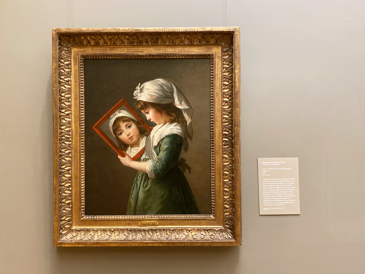 Two more noteworthy paintings are Anthony van Dyck’s portrait of the Queen of England Henrietta Maria (1636) and Elisabeth Louise Vigée Le Brun’s “Julie Le Brun (1780–1819) Looking in a Mirror” (1787) which includes a mirror reflection of her only child Julie with a rather impossible perspective.