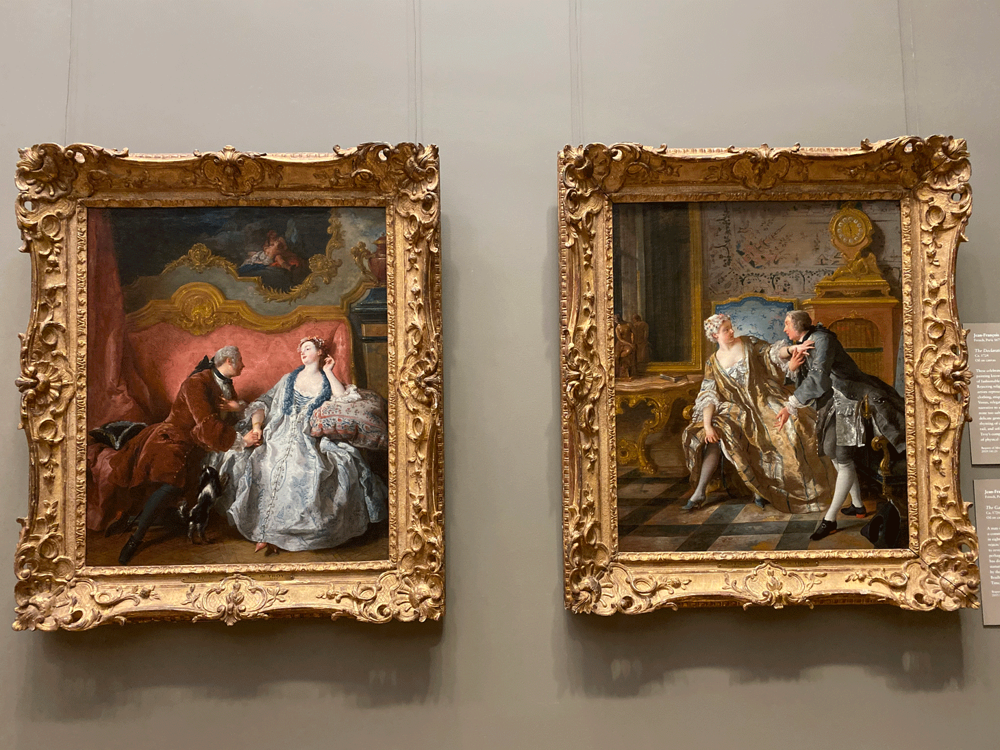 Other standouts in this gallery include amorous paintings by Jean François de Troy, “The Garter” and “The Declaration of Love” (both ca. 1724). In the first, a woman is seen rejecting a man offering to reattach her garter, and in the second, an unaffected woman listens to a man confessing his love to her. Troy is credited with establishing the painting genre known as tableaux de mode (paintings of fashionable society), which depicts the lifestyle and social mores of the French elites in the 18th century. “These genre pictures take one into the luxurious lives of 18th-century well-to-do in a unique way,” Christiansen told Hyperallergic. “De Troy was the master of this genre, and there are no finer ones anywhere. They give a new, much needed accent to the collection of 18th-century French painting.”According to Christiansen, the Wrightsmans acquired these two paintings in 1955 and promised to eventually gift them to the Met. “We did not even think of bidding for it since we knew these would come to us,” he said.