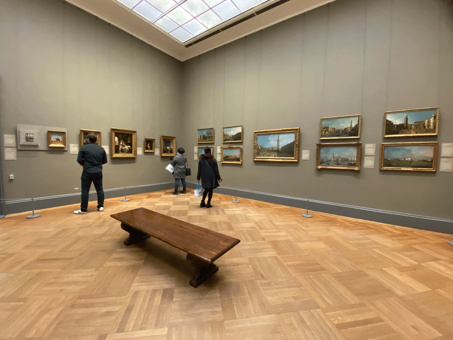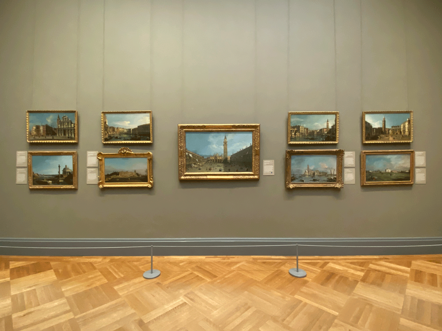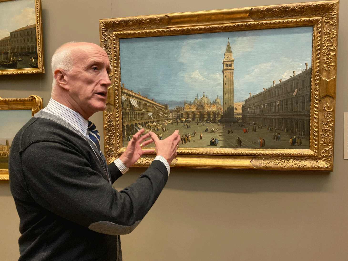 “These are permanent reminders of the glories and the beauty of this magical place,” Austin Chinn, a volunteer guide at the Met, told Hyperallergic while guiding a group of visitors through the gallery. “There’s no church building in mainland Europe that resembles this dream,” he enthused about St. Mark’s Basilica in Venice, which is depicted in Canaletto’s “Piazza San Marco” (circa late 1720s).