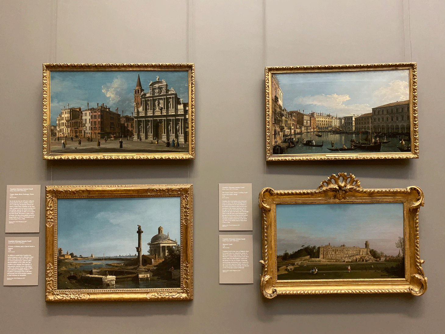 An entire wall in the European paintings galleries is dedicated to landscape paintings of Venice, a city that was recently submerged in historically-high floodwaters. Six paintings by the 18th-century painter Giovanni Antonio Canal, commonly known as Canaletto, depict the city’s iconic Piazza San Marco, its Grand Canal, and other landmarks. They join eight existing Canaletto works that Wrightsman previously donated to the museum.