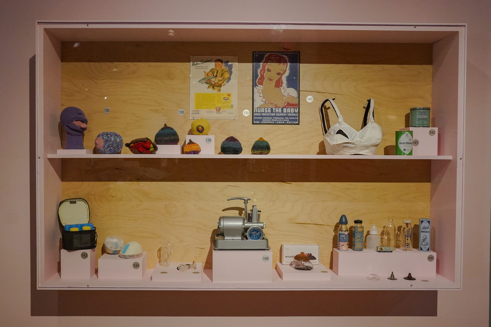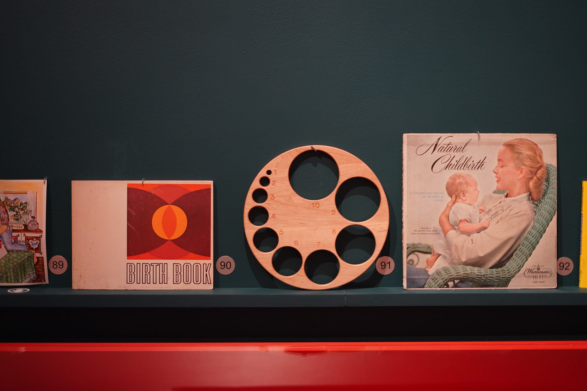 Menstrual cups, birth control pill packs, IUDs, pessaries, nursing bras, baby bottles, strollers, and snot suckers are among the items that take the spotlight in Designing Motherhood: Things That Make and Break Our Births. These and other objects that support reproductive health and childrearing, displayed on the walls and vitrines at the Museum of Arts and Design (MAD), may be familiar to you. They might even be tucked in your medicine cabinet, underwear drawer, or bag right now, or entangled with memories from your childhood or stories from your parents or grandparents. Every consumer product, societal system, and architectural space in the full-floor exhibition — featuring more than 250 examples spanning the past 150 years or so — illuminates how design shapes diverse experiences of parenthood, from navigating fertility and conception to pregnancy, birth, and postpartum life.