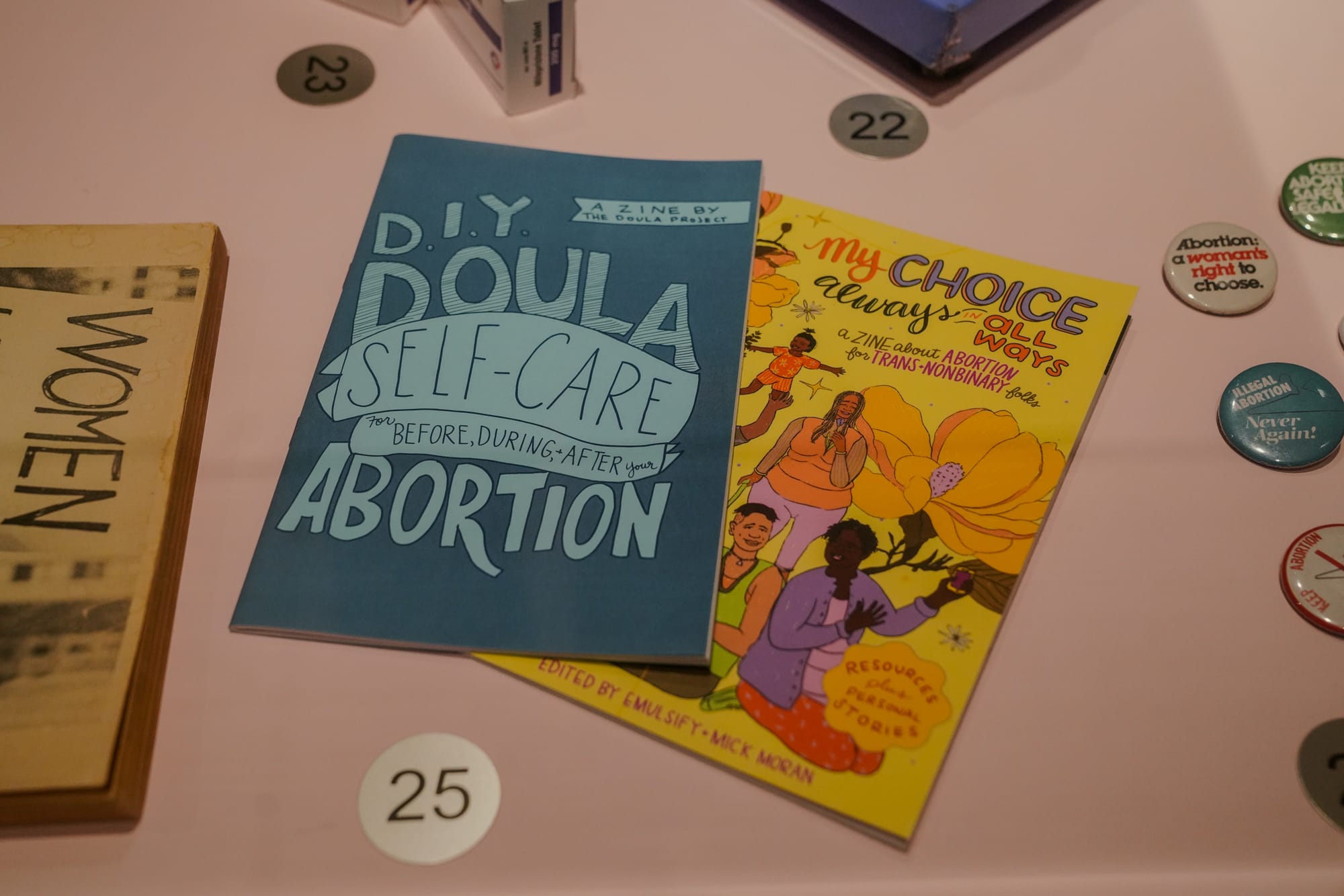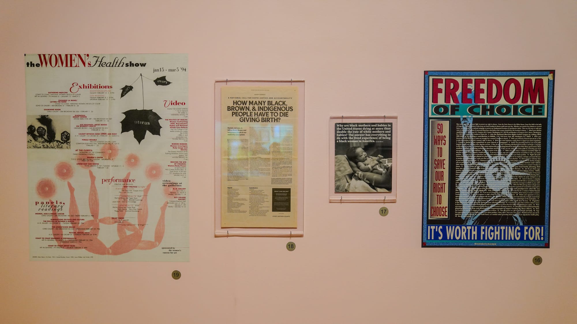 Other New York City-centric designs make appearances, too, including the once-ubiquitous NYC Condoms (2007) and posters with information in 14 languages about the New York City Abortion Access Hub. The show continues with sections devoted to menstruation, conception and pregnancy, community care and knowledge sharing, tools for pregnancy and postpartum care, and baby gear. Throughout, the displays highlight the challenges of navigating the healthcare system, barriers to accessing care, and the alarmingly high rates of maternal deaths in the US, a crisis that disproportionately affects Black women.