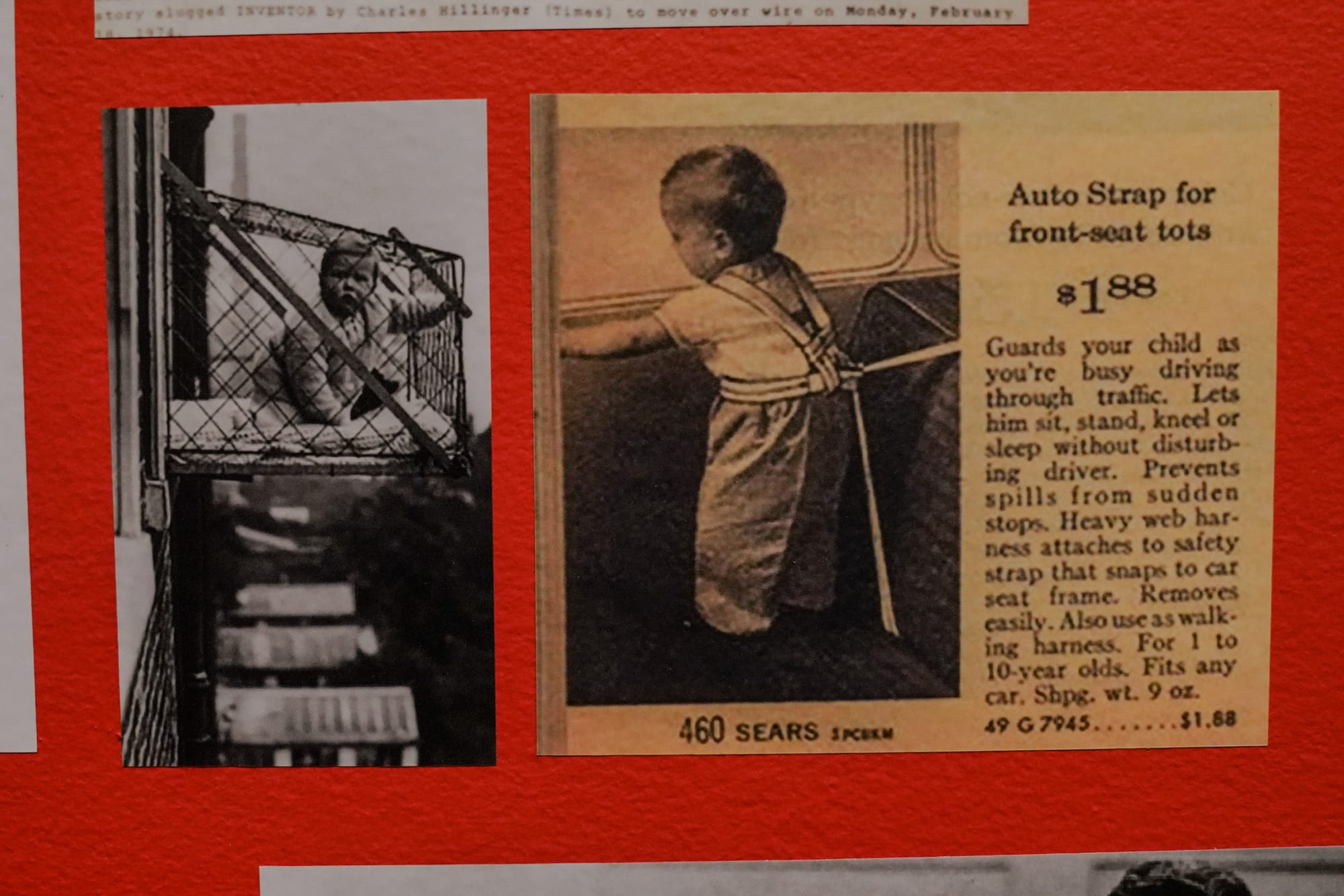 From the oldest objects (a 19th-century breast pump and reproduction of a speculum from c. 79 CE) to the most of-the-moment products from 2025 (a donut pillow, a Mamava breastfeeding bench), Designing Motherhood adds detail and dimension to even the most familiar items. With its vast and varied collection, it chronicles the promise of design to improve lives, as well as its failings. A memorable presentation of advertisements reveals products that seem wildly unsafe by today’s standards (including a “portable baby cage” and an “auto strap for front-seat tots”). All were produced prior to 1972, when the US Consumer Product Safety Commission established federal safety regulations and systems for recalling dangerous products and reducing risk of injury. As the wall label notes, staffing and funding for this government agency remains uncertain.