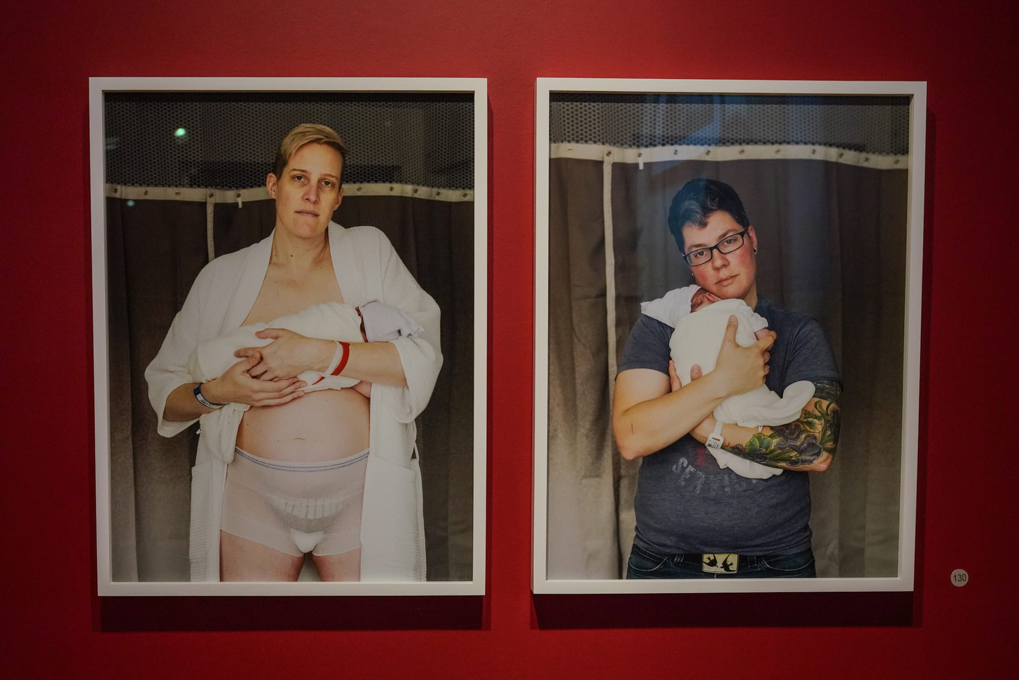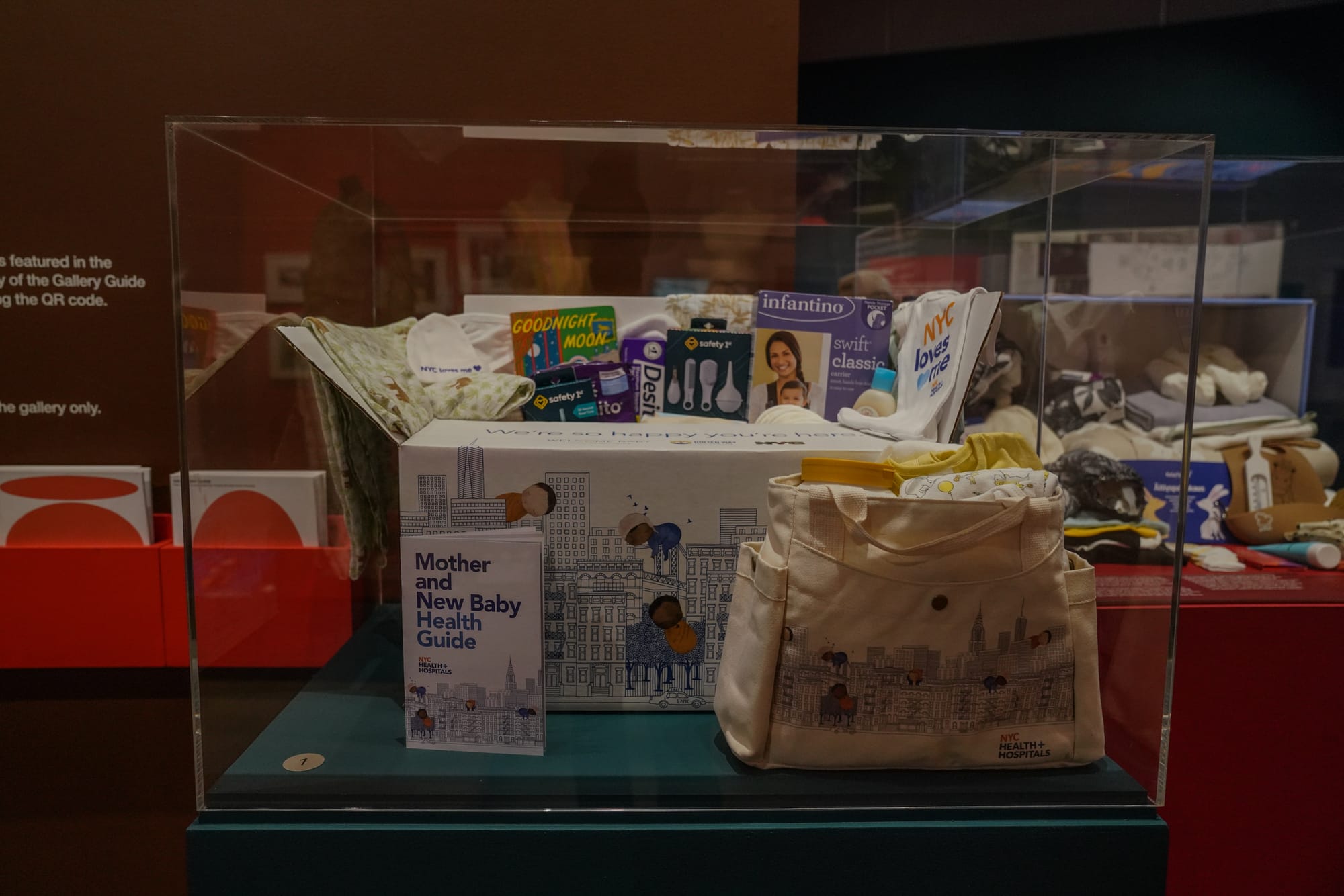 The show opens with a section on labor and birth, and a trio of “baby boxes” — kits stocked with essential supplies for newborns and their caregivers. An Äitiyspakkaus (maternity package) from Finland offers a glimpse at a contemporary version of the original baby boxes, which launched in the country in 1938. The Finnish government provides these starter kits to new parents free of charge. This concept eventually spread to other countries, only recently making its way to the United States. A sample NYC Baby Box — available to those who give birth at four NYC Health + Hospitals locations as of October 2025 — displays its contents: diapers, clothing, and rash cream, to name a few. (Recently, mayor-elect Mamdani announced plans for NYC Baby Baskets stocked with similar supplies and resources for new parents.)