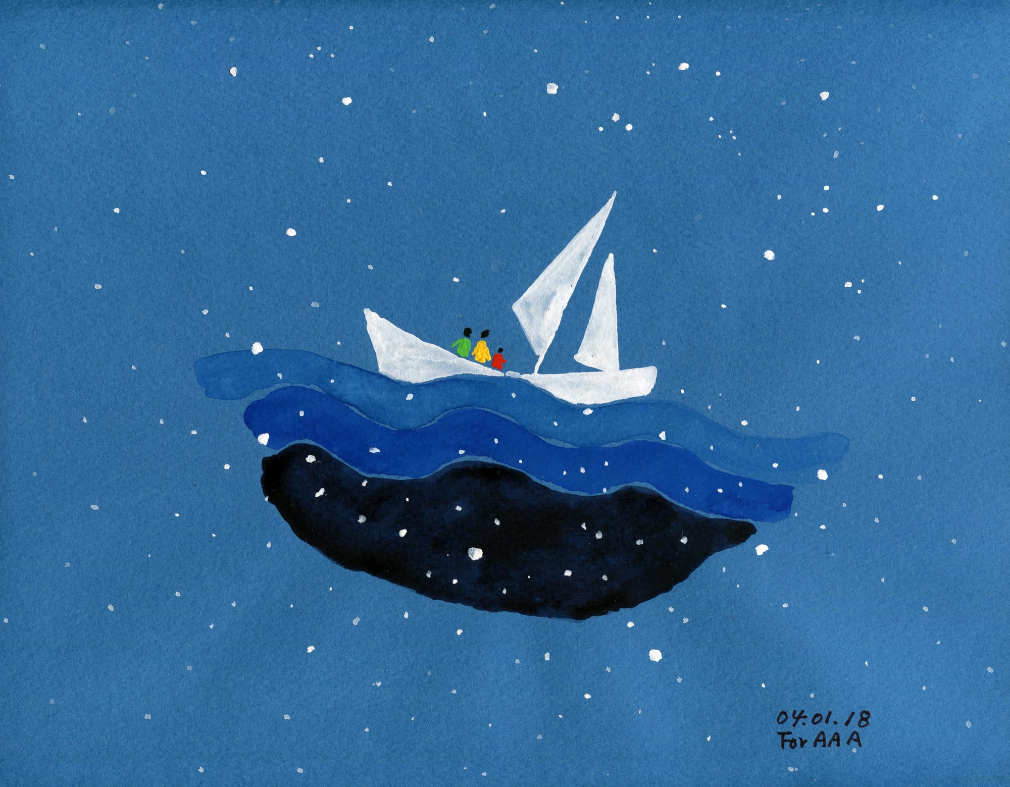 Browsing the account, I feel happy and sad, mentally toggling between my interest in this particular family and an overwhelming curiosity and love for my own. So does Ji: “I also have lots of mixed feelings, and often I feel the warmth in my heart and sometimes my eyes fill with tears. There are the quiet and intimate feelings as a son looking at the drawings and stories my parents create every day: Stories about their youth, their daily observations about the fast changing world … I contemplate their future, our past as a family of immigrants, our fights and laughters.” Astro, Arthur, and Allan are consistent stars — first shaves, Halloween costumes, birthday parties — mostly in paintings and sometimes in photographs. Grandpa Chan and Grandma Marina are wistful about the boys’ childhood as it fades in real-time, their grandchildren’s growth synonymous with their own — a simultaneous close-knitting and unraveling for which they feel both pleased and forlorn. Aging, time, and memory are the truths of Drawings for My Grandchildren. Not happening upon them solely by chance forces a kind of soft confrontation with their fact, and so it’s a tender gut-punch. I want to read it all, then spend quality time with someone and make a premonitory memory of my own.