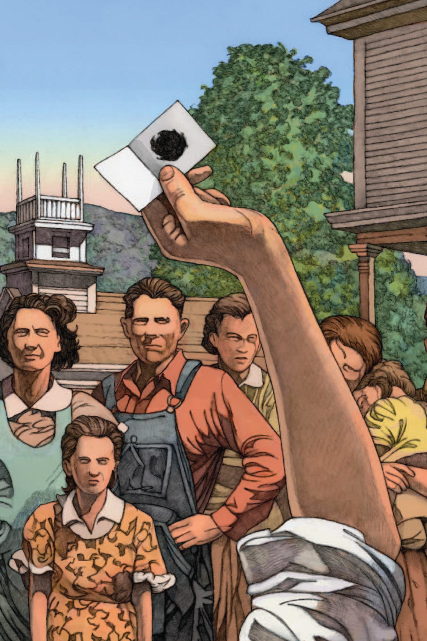 Another way Hyman’s contemporary visual interpretation of “The Lottery” is significant is that it presents the community as an entirely white one. Readers of the original story could have easily inferred this, but Hyman’s retelling confirms it. So while Jackson’s allegory offers layered warnings about the dangers of historically justified closed-mindedness and mob behavior — which, throughout time, has fueled violence against specific groups based on identity— at surface level, it uses a homogenous community to play out its point to its absurd, barbaric conclusion. Hyman’s adaptation is a strong effort to retain the original tale’s sparse horror while making the most of its compelling visual possibilities.
