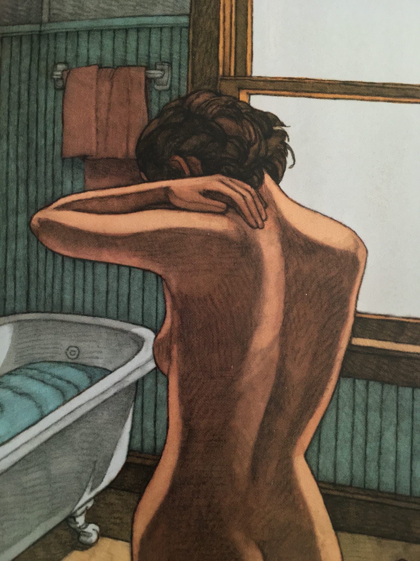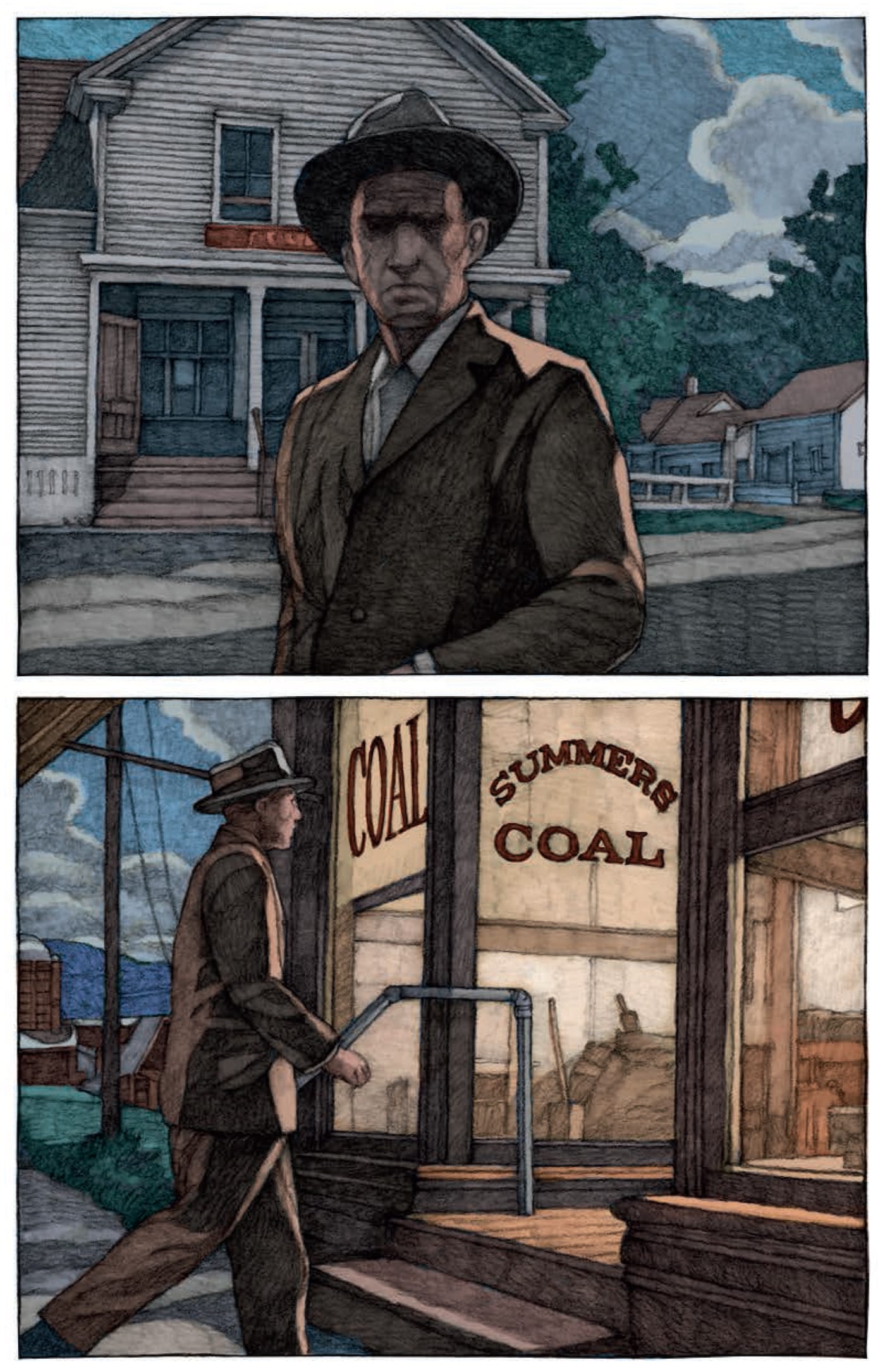 The drama of Hyman’s shadowing carries forward from that evening into the next morning — “The morning of June 27 was clear and sunny, with the fresh warmth of a full-summer day,” Jackson began. Hyman’s muted colors and heavy shadows negate summer airiness, just as the mundane scenes — chopping wood, looking out the window, a hand on a doorknob or fingers unbuttoning a shirt — are made meaningful through careful framing.