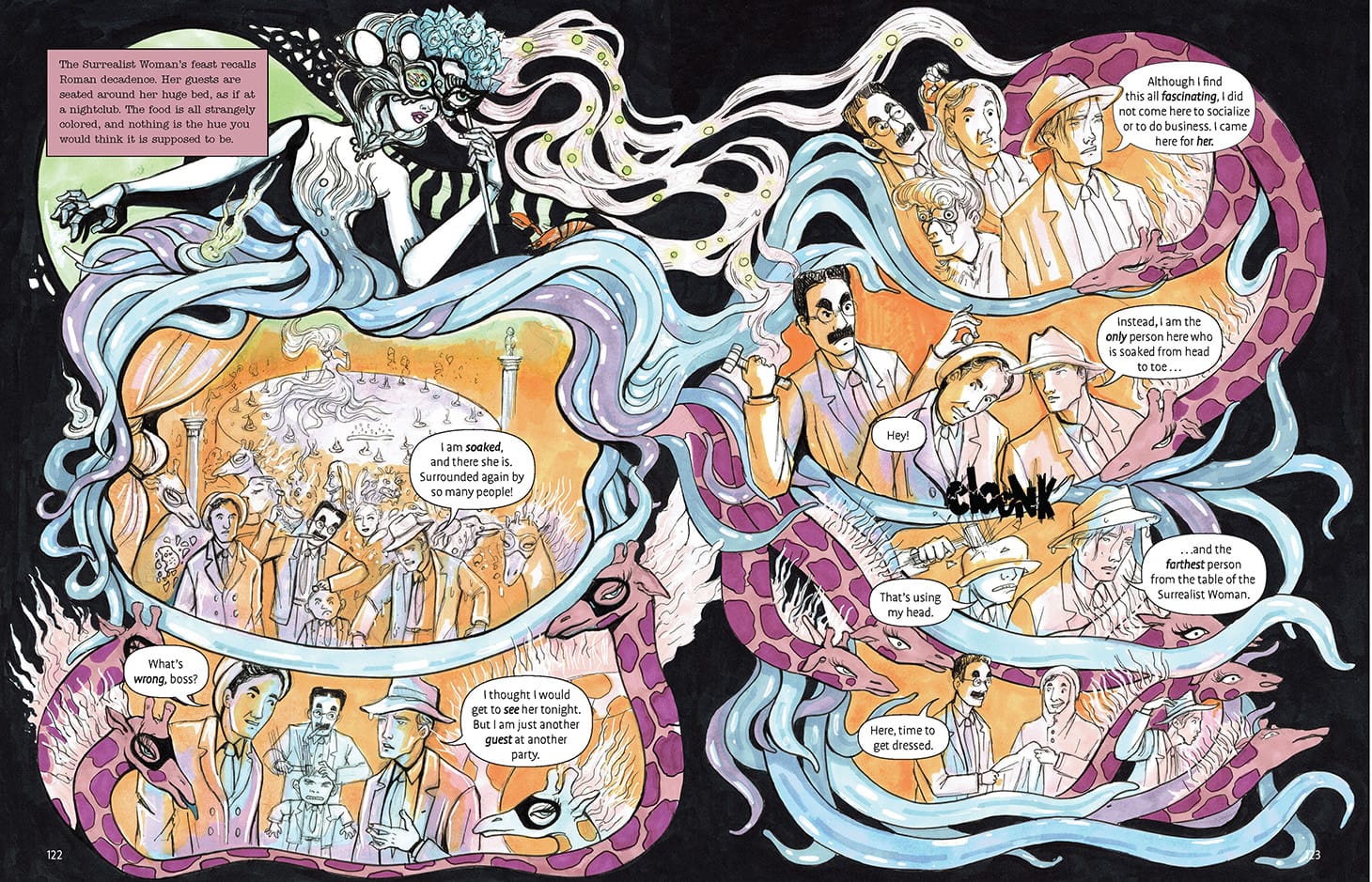 The pages illustrated by Spanish artist Manuela Pertega are, for lack of a better term, frame-worthy. She ditches the grid format that characterizes straight-up narrative sequences in favor of pages designed to express the Surreal Woman’s conjuring up of surrealists fantasies. Neatly positioned arabesques and serpentine motifs translate the flight of fancy the characters experience when interacting with the Surreal Woman, those pages look like a maximalist hybrid of Dalí’s style, art nouveau, and the anime-like ethereal artworks of artist Yoshitaka Amano. Said visuals, which alternate between black-and-white for everyday-life segments, and saturated colors depicting anything involving the Surreal Woman, almost have the capacity to negate the need for text blocks altogether.