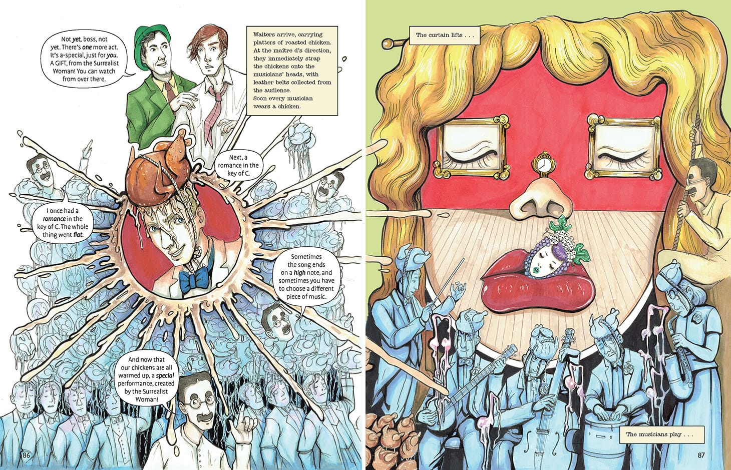 Even though the writers Frank and Heidecker are witty and irreverent while making sense of both Dalí’s worldview and the Marx brothers’ dynamic, their text interrupts, almost disturbs the sheer beauty of Manuela Pertega’s work. What’s written on the page, in all its screwball and vaudevillian glory, can be quite overwhelming to the reader, making the choice, as their eyes focus on text or image or design, tricky and exciting. Reading graphic novels allows for a fluid back and forth in looking at text and image. In this case, the text approximates a default mechanism to be leaned on when trying to make sense of the surreal illustrations. This is not a disparagement of the value of the book, but a reflection on the limits of a still image for a project of this scope. We can and might hope that, soon enough, an animation studio will pick it up and bring both the script and the visuals to life.
