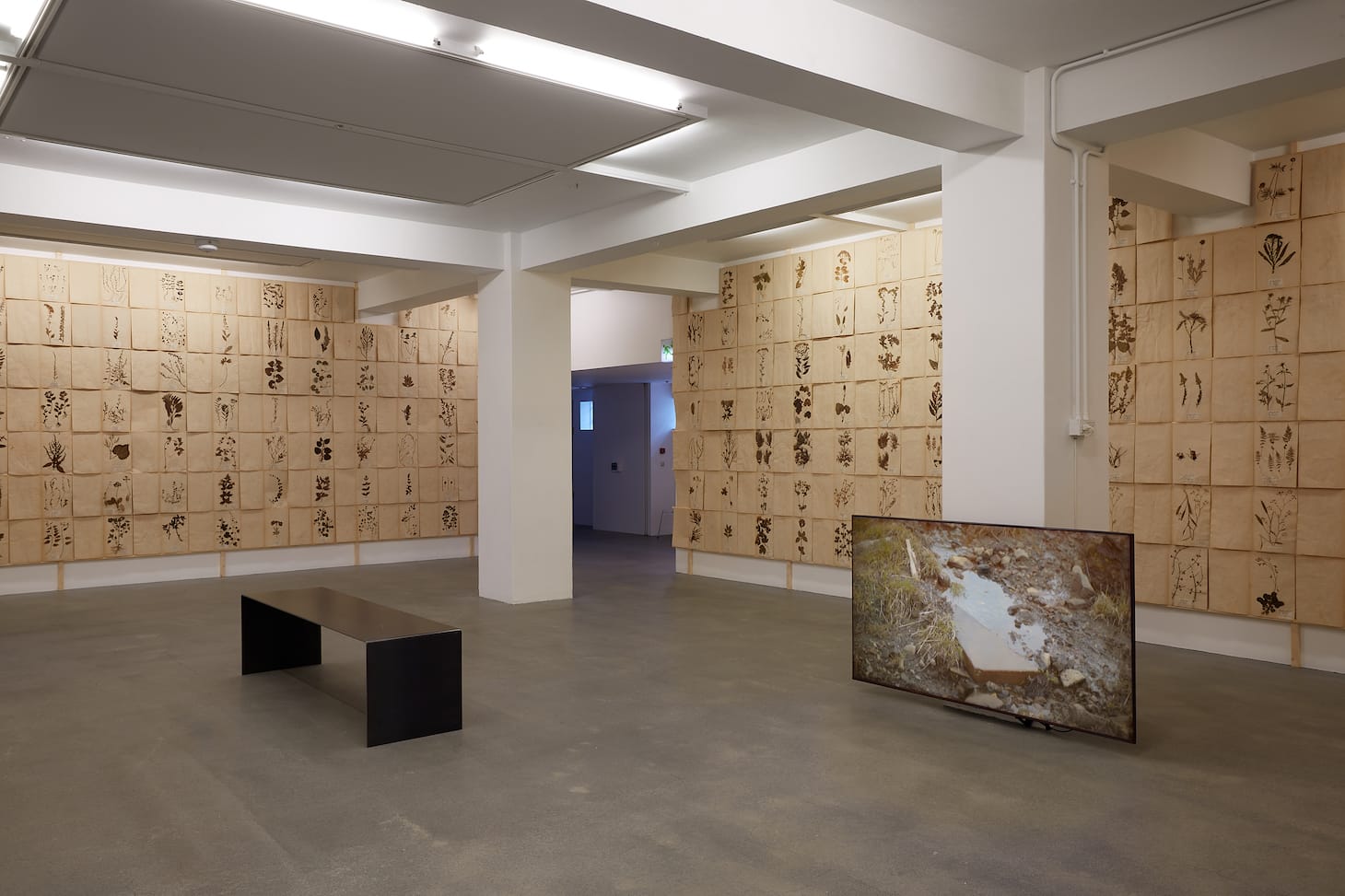 With “Herbarium (cosmology)” (2021), Bjarki Bragason has joined a long list of international artists, including Herman de Vries, working with plants, and of artists working with archives. He covered the walls in a big room with sheets of paper, each featuring an exposed plant, from an archive a German family gave him; this archive of major German plants was compiled by the family’s 19th-century pharmacologist ancestor. On the floor are two videos of a huge compost heap where old soil from gardens is discarded; one shows new plant life emerging. History and the present, classification and wildness, are juxtaposed.