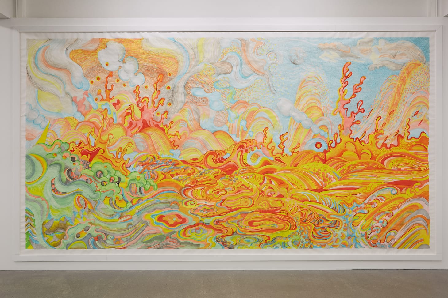 It is refreshing to encounter Guðmundur Thoroddsen’s oil paintings (the exhibition’s only paintings), with their soft colors, earth tones, and often horizontal brushwork; they suggest Icelandic landscapes, or rather a mix of landscapes and abstraction. Keep looking and a weird figure emerges, a dog smoking a cigarette, or smoking something. Also refreshing are Styrmir Örn Guðmundsson’s fantastical, brilliantly colored ink on paper drawings, including the surging and swirling “Eruption” (2021).