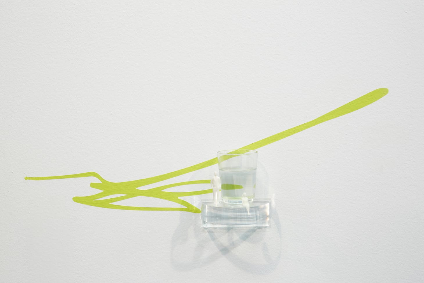 Arnar Ásgeirsson’s exceptionally small sculptures installed on two walls are eccentric and engaging. Most feature one or two people in domestic settings, in front of a glass of water that stands taller than them, and with a colorful squiggle on the wall.