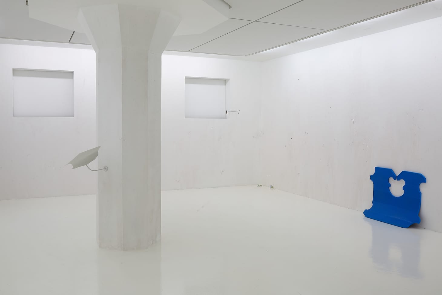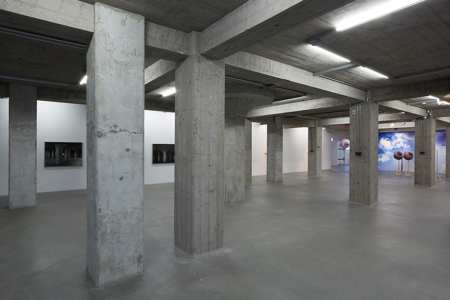 Across this space are Elín Hansdóttir’s architectural interventions (“Fractal,” 2021). Using assorted materials, she inserted six convincing new gray concrete pillars among the actual structural ones. These extra, oddball pillars make the space feel askew, unbalanced, suddenly strange. Inkjet prints on the walls purportedly show the pillars in situ. One does, but others are of models, in various sizes and states, that the artist built. Actual, altered, and simulated architecture combine in a work that both fits with and disrupts its surroundings.