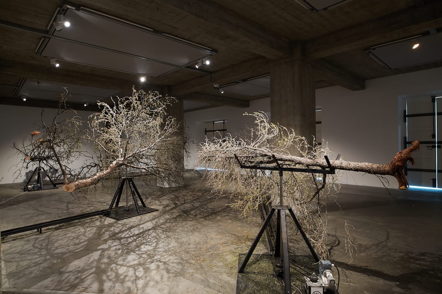 In Tryggvadóttir’s nature-technology hybrid, six dead horizontal trees (they were not cut down for this work, but instead during normal forest maintenance), which fill much of the space, slowly rotate counterclockwise, confronting viewers and restricting their movements. This work has a slow-motion grandeur and it’s great to pay attention to trees themselves as sculptures, and their shadows. I heartily endorse how this work questions the uneasy (at best) relationship between nature and humans. Still, while likely novel in Iceland, it is linked with many works (albeit most not motorized) from outside of the country.