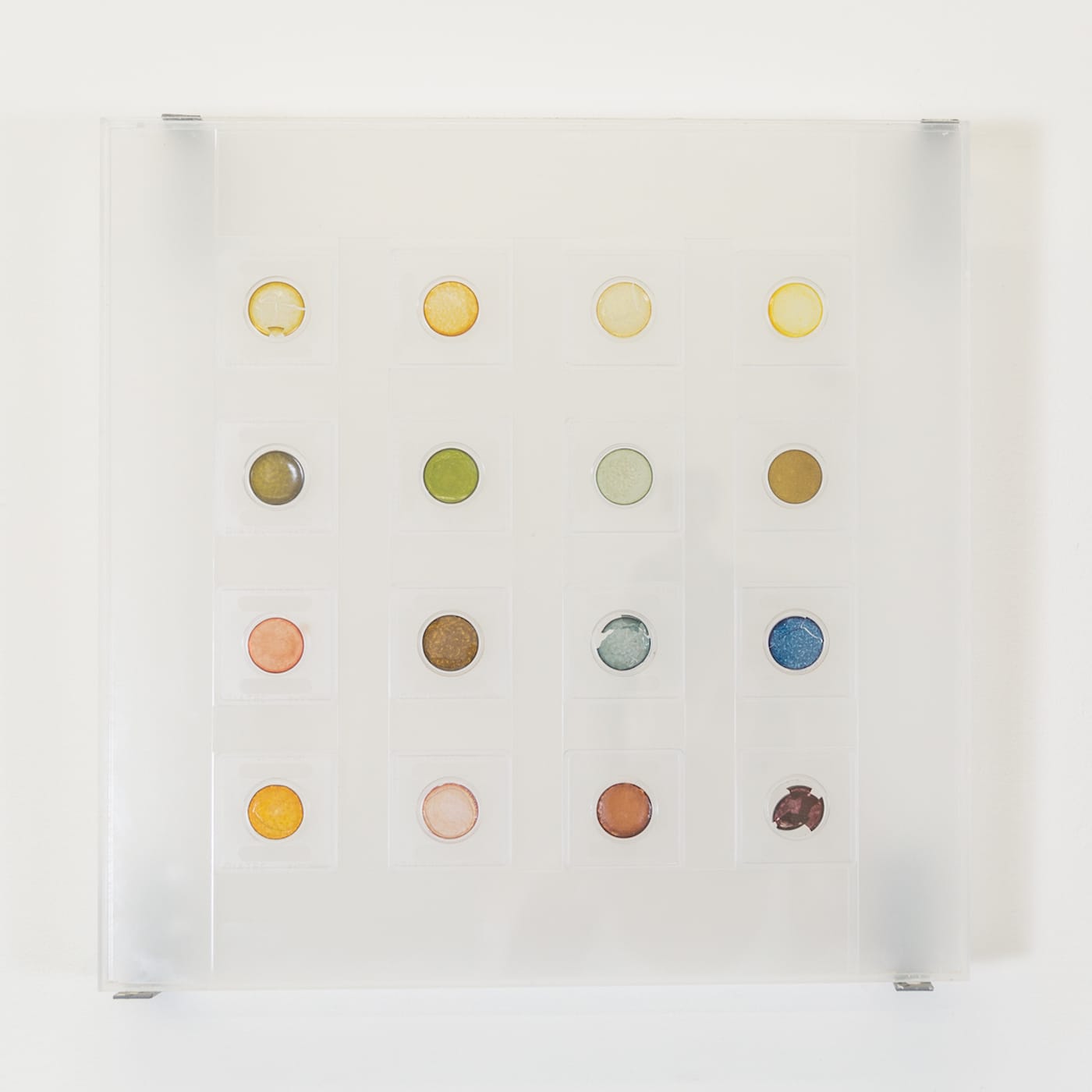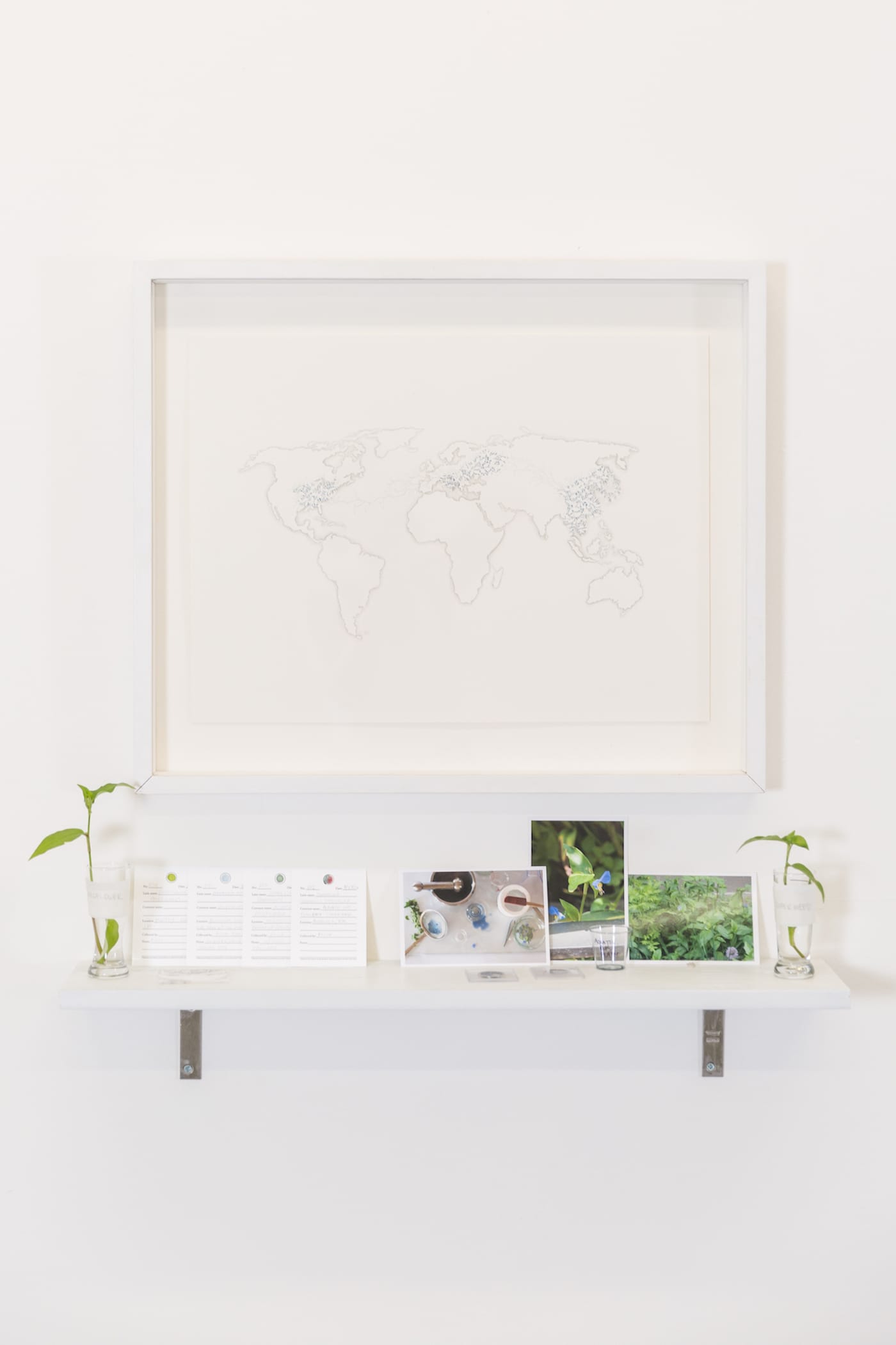 Irons, who previously spoke to Hyperallergic about her practice, demonstrates the resilience and ingenuity of these marginal species, charting invasive plants like Asiatic dayflower and pokeweed through their migration both into and out of the US. In her work “Asiatic Dayflower (Commelina communis)” (2012), she tracks the introduction of the flower to the US from China following the Columbian Exchange and observes how the plant’s evolution is specifically intertwined with human systems. A map illustrates the flower’s movement, colored with pigment extracted from the plant’s own petals. This is a technique the artist also utilizes in “Invasive Pigments Grid, New York, NY” (2016), in which colorful dot matrices fill a pair of plexiglass squares, each containing round samples of plant pigments that appear like a cross between a microscopic sampling and a watercolor swatch.