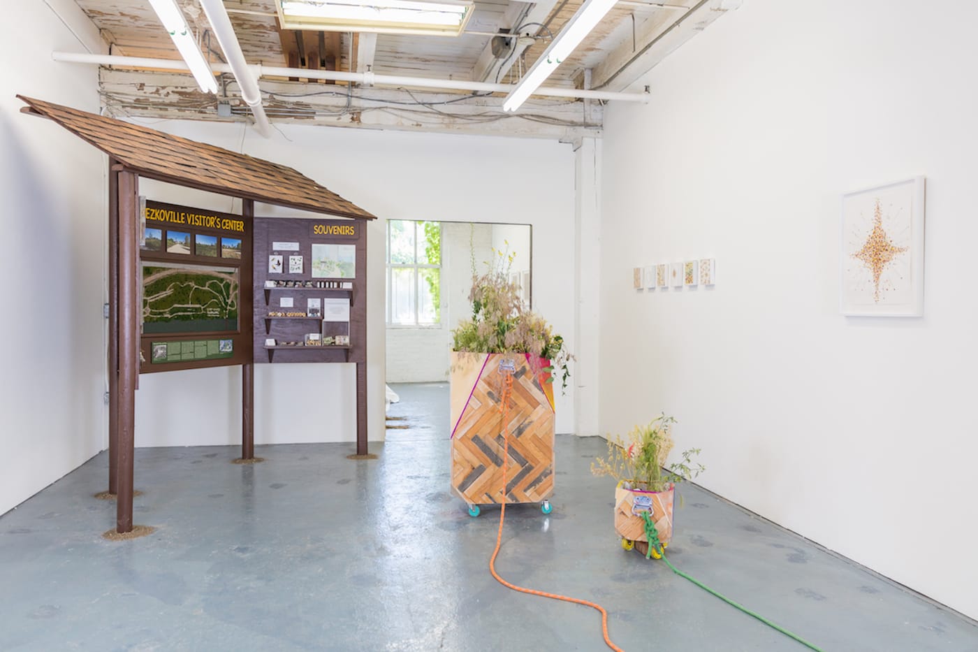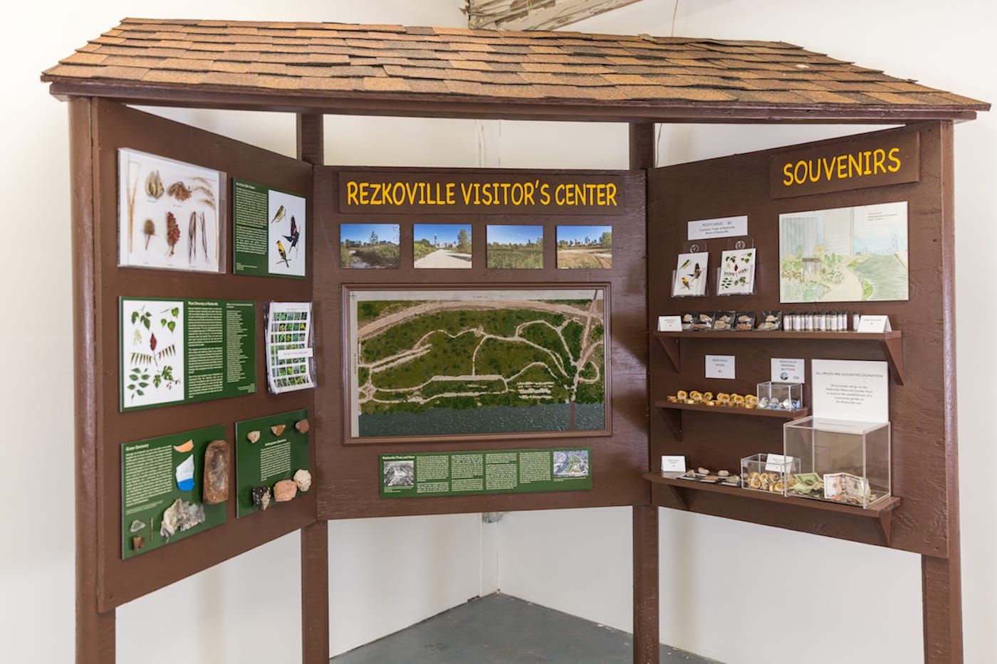 CHICAGO — Several didactic signs line the walls of Stella Brown’s “Rezkoville Visitor’s Center” (2017), a wooden tri-walled structure situated in the back left corner of Goldfinch’s exhibition Marginal Green. Each sign is written to inform the viewer about the plants, birds, or assorted detritus one might have found while exploring the area’s 62 acres on the Chicago River’s east bank — an overgrown post-industrial patch nicknamed for its previous owner, Antoin “Tony” Rezko, which was razed for residential and commercial development in late 2016. Like the rest of the artworks in the exhibition, this installation pays homage to the species that manage to thrive on the outskirts of American cities’ concrete plots. Works by Ellie Irons, Jenny Kendler, and Jaclyn Jacunski also attempt to reposition peripheral plants within a centralized narrative, their work focused on how the plants’ systems are entangled, both socially and environmentally, with our own.