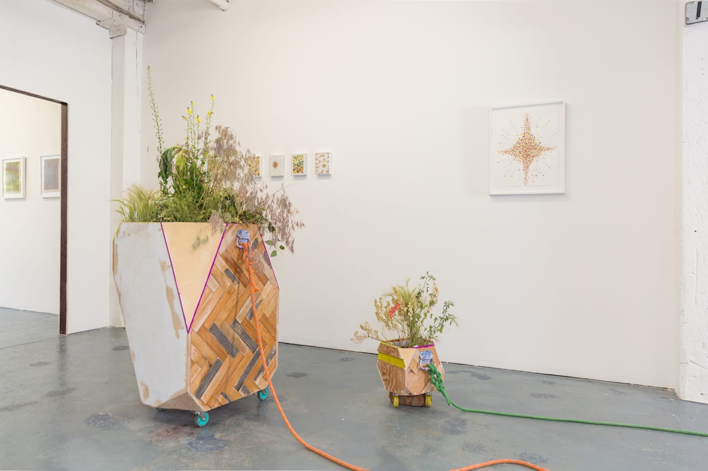 Two garden boxes, one large, the other small, lay at the center of the exhibition, attached to the front wall by thick lengths of salvaged arborists’ ropes. Jenny Kendler’s “Study for Garden for a Changing Climate” (2017) will incrementally shift toward the north end of the gallery during the course of the exhibition. Kendler’s intention is for the wheeled boxes to physically demonstrate the way global warming disrupts species’ natural growth patterns, moving from south to north. The reclaimed planters contain a lush variety of plants relocated from the gallery’s East Garfield Park neighborhood, an area that is home to many abandoned lots overgrown with grasses. Kendler glorifies the collected species as garden inhabitants rather than eyesores or nuisances, as well as imagines a futuristic landscape design in which stubborn weeds and other marginal plants are the only flora we have left.