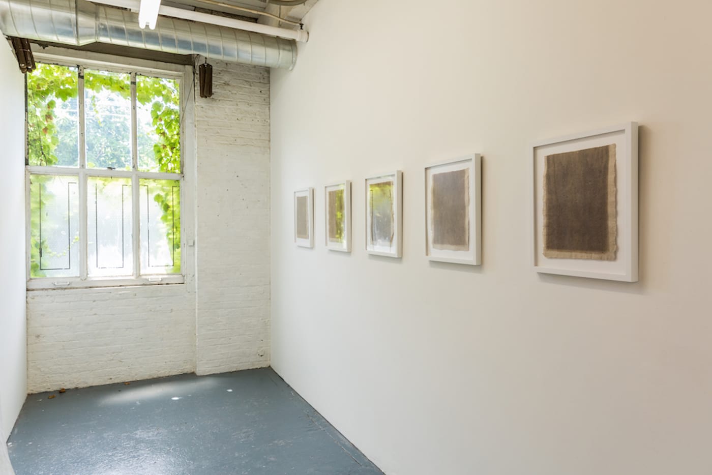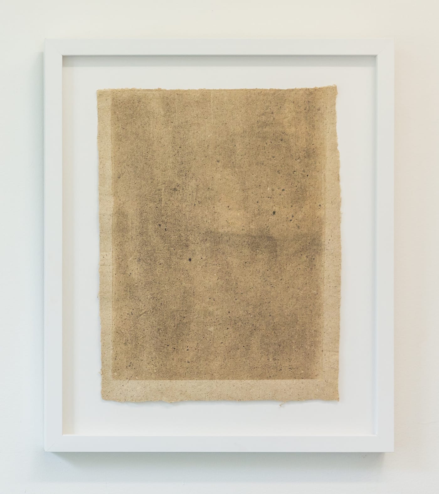 Jaclyn Jacunski also sources from the neighborhood for her works, which fill the gallery’s back room. In perhaps her most direct piece, a camera obscura softly projects the surrounding landscape onto the walls of a dark, makeshift room. Although I appreciate the attempt to recast the overgrown outside environment within, her other works present a more physical embodiment of this directive, like her aesthetically minimal, thoughtfully composed series “Colorfields” (2017), which presents six brown pieces of paper produced from native prairie plants collected from polluted plots across Chicago, dyed with inks made from the soil of the matching site. Jacunski marks the transformed plants with large swatches of original sediment, reintroducing the toxins that contaminated their roots.