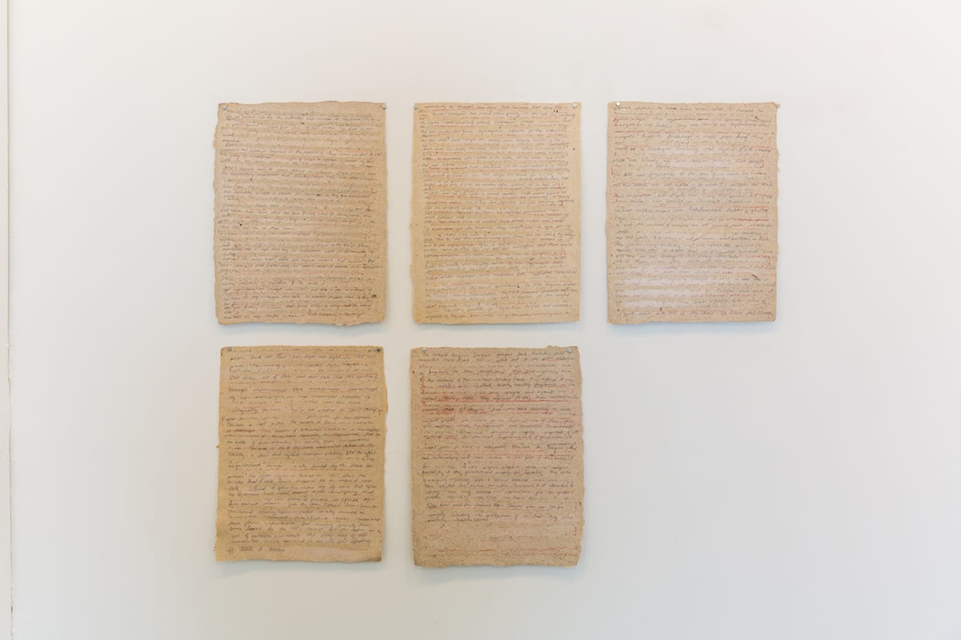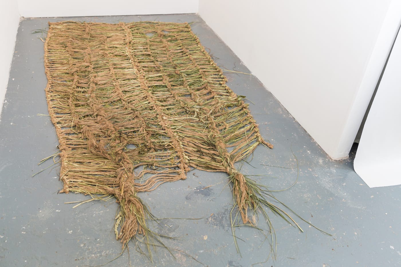 Similar plants compose her woven floor piece “Body Tracks” (2017), which lies on the opposite side of the gallery. One must walk across this braided mat to read the fine handwriting scrawled across “Margins, Borders, Lines” (2017), passages pulled from Ta-Nehisi Coates’s 2014 article “The Case for Reparations,” which, among other subjects, speaks about redlining in Chicago neighborhoods, specifically Garfield Park. The text is nearly impossible to read, even up close, but the juxtaposition of these quotes and the scattered red lines on locally sourced materials directly addresses the social nature of this specific marginalized landscape.