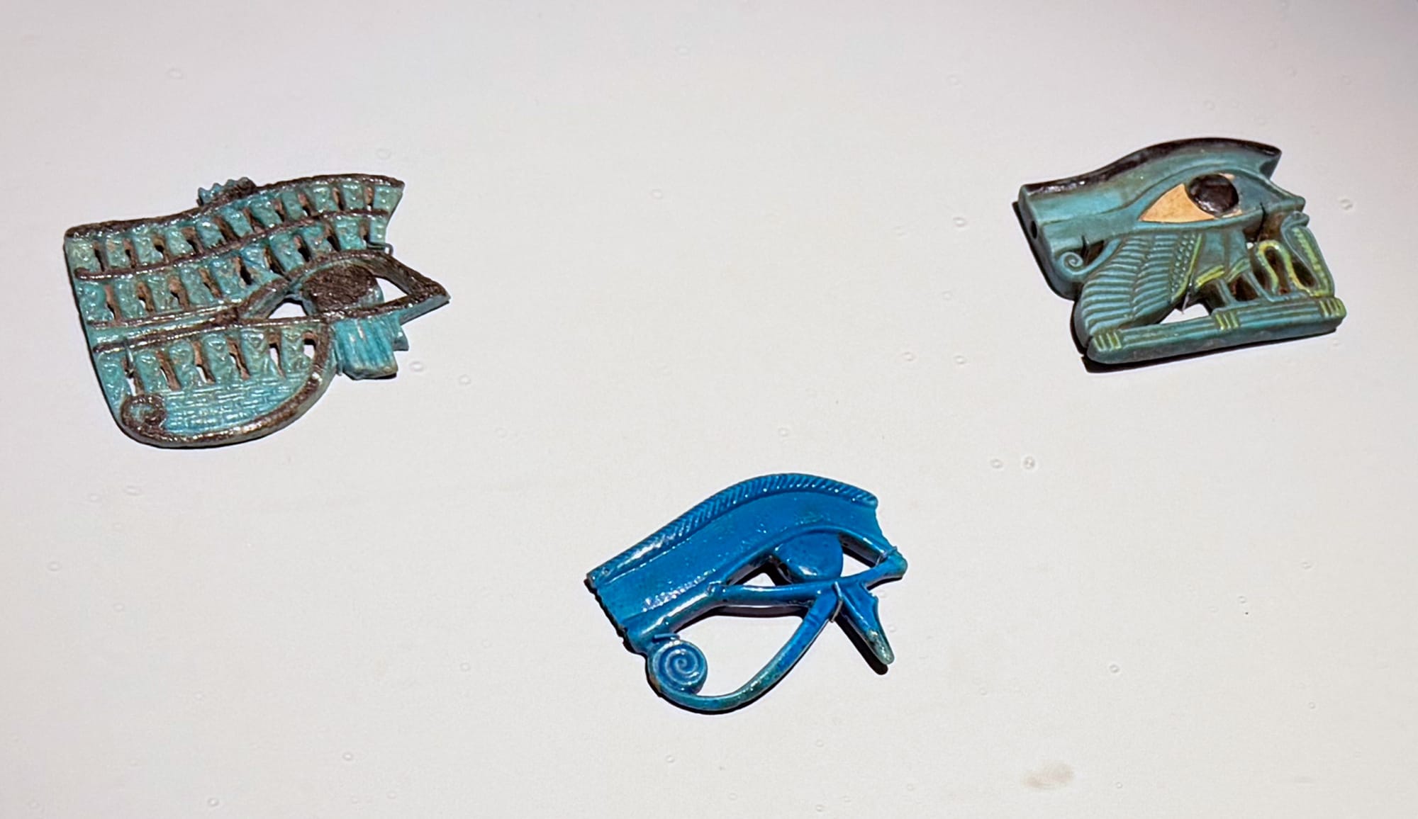 Before Osiris properly enters the land of the dead, the aforementioned goddess Isis — this time in the form of a bird of prey — hovers over her husband’s erect penis to conceive Horus, their only heir. (We unfortunately don’t get any of this visual in Divine Egypt.) Horus was raised in hiding, but when he’s all grown up, he beats Seth and wins the throne, avenging the dad he never got to meet. Egyptian pharaohs loved Horus, as he was the god most linked ideologically to the king, and they certainly loved using him to decorate. A sizable limestone double statue from the New Kingdom (c. 1343–1315 BCE) of King Haremhab and a falcon-headed Horus, together as apparent equals, exemplifies how he was often depicted. His story became about more than who he was in relation to his parents, and depictions of him also appear early in the exhibition in the foundational context of the hieroglyphic ankh (a key-like symbol symbolizing life), falcon, and sun. The eye of Horus, which comes from the myth that Seth pulls out Horus’s eye before Horus kills him, is a good luck charm that both peasants and pharaohs carved into their possessions. Think of it like a bumper sticker announcing one's proclivities for royalty and health.