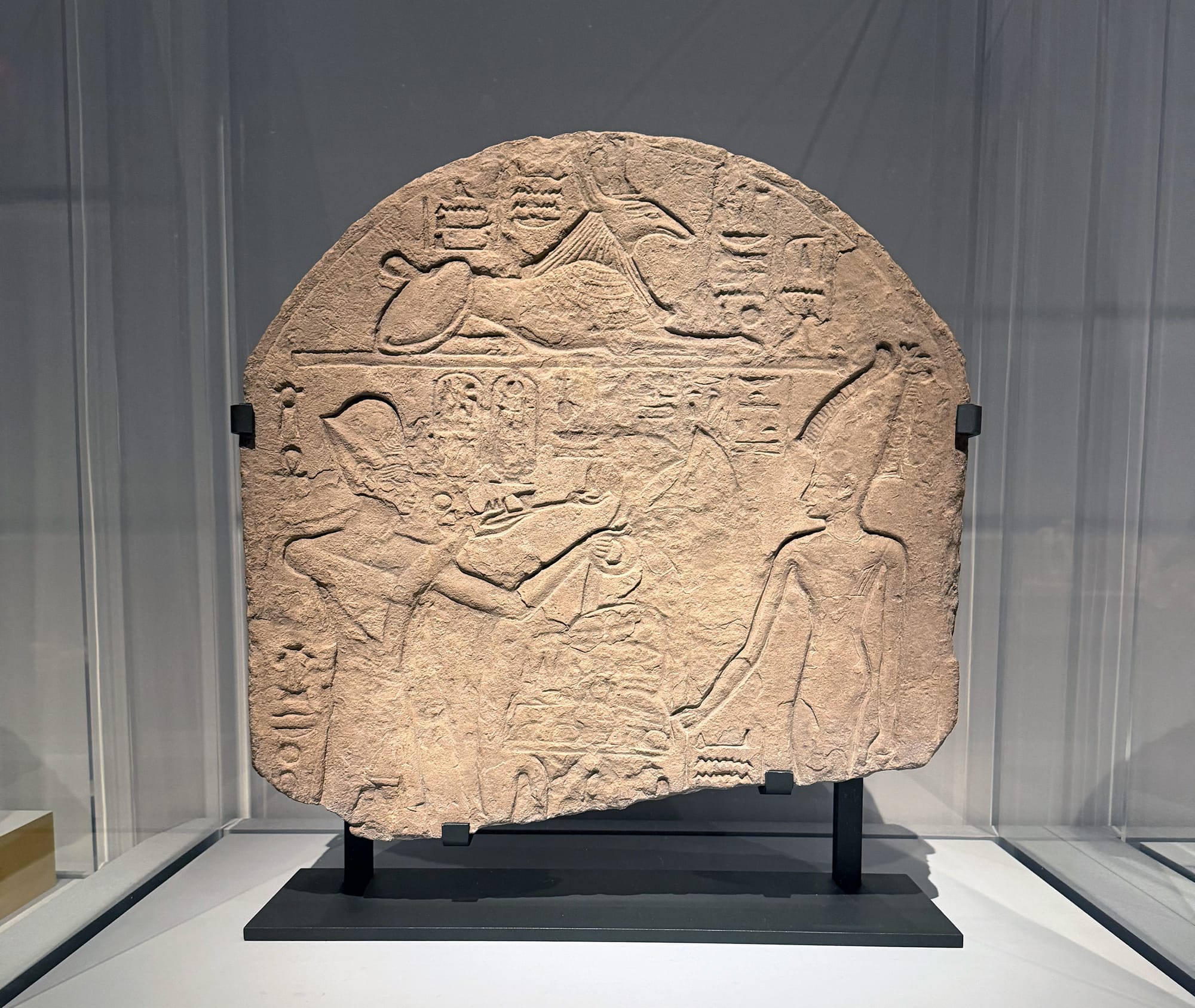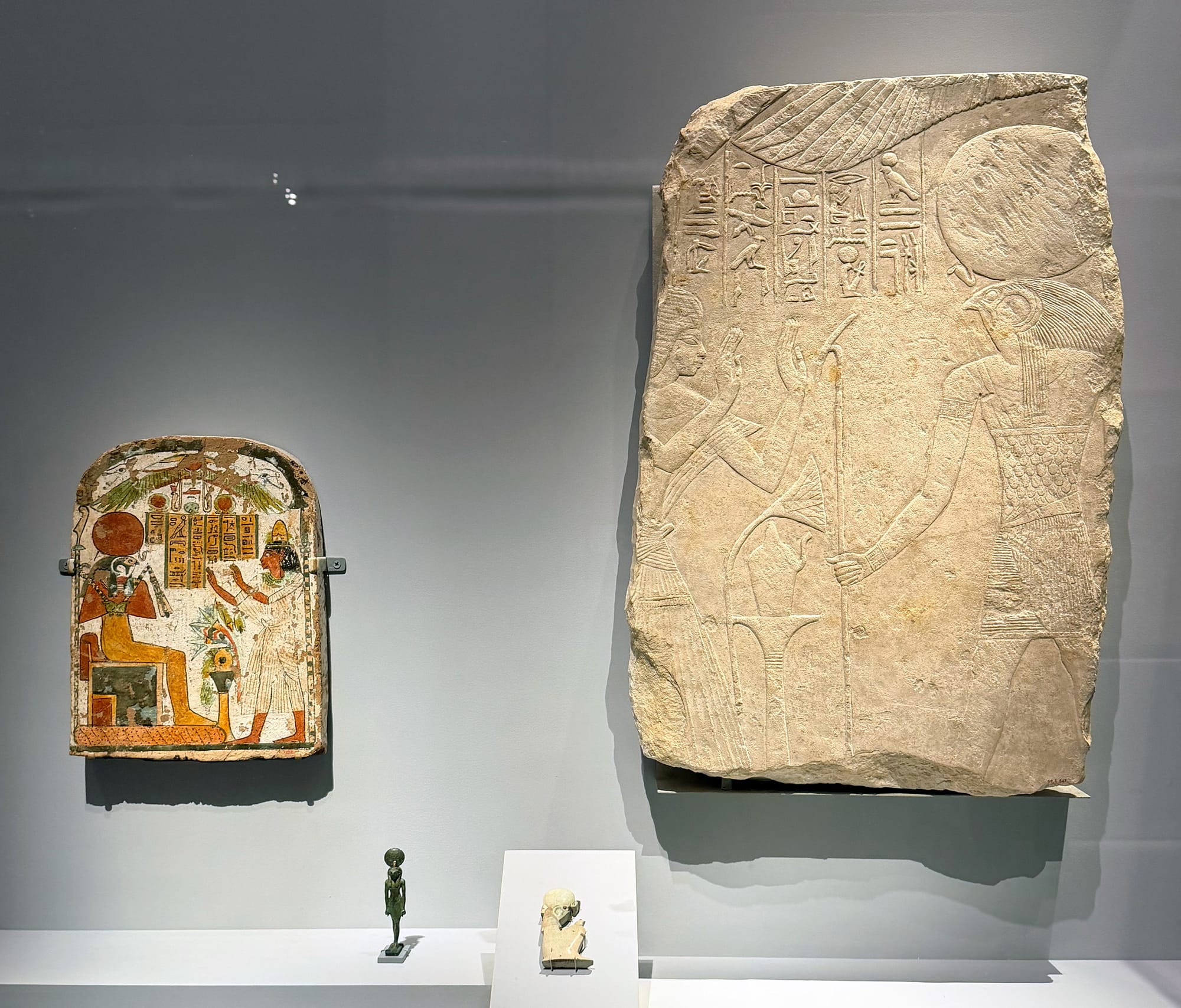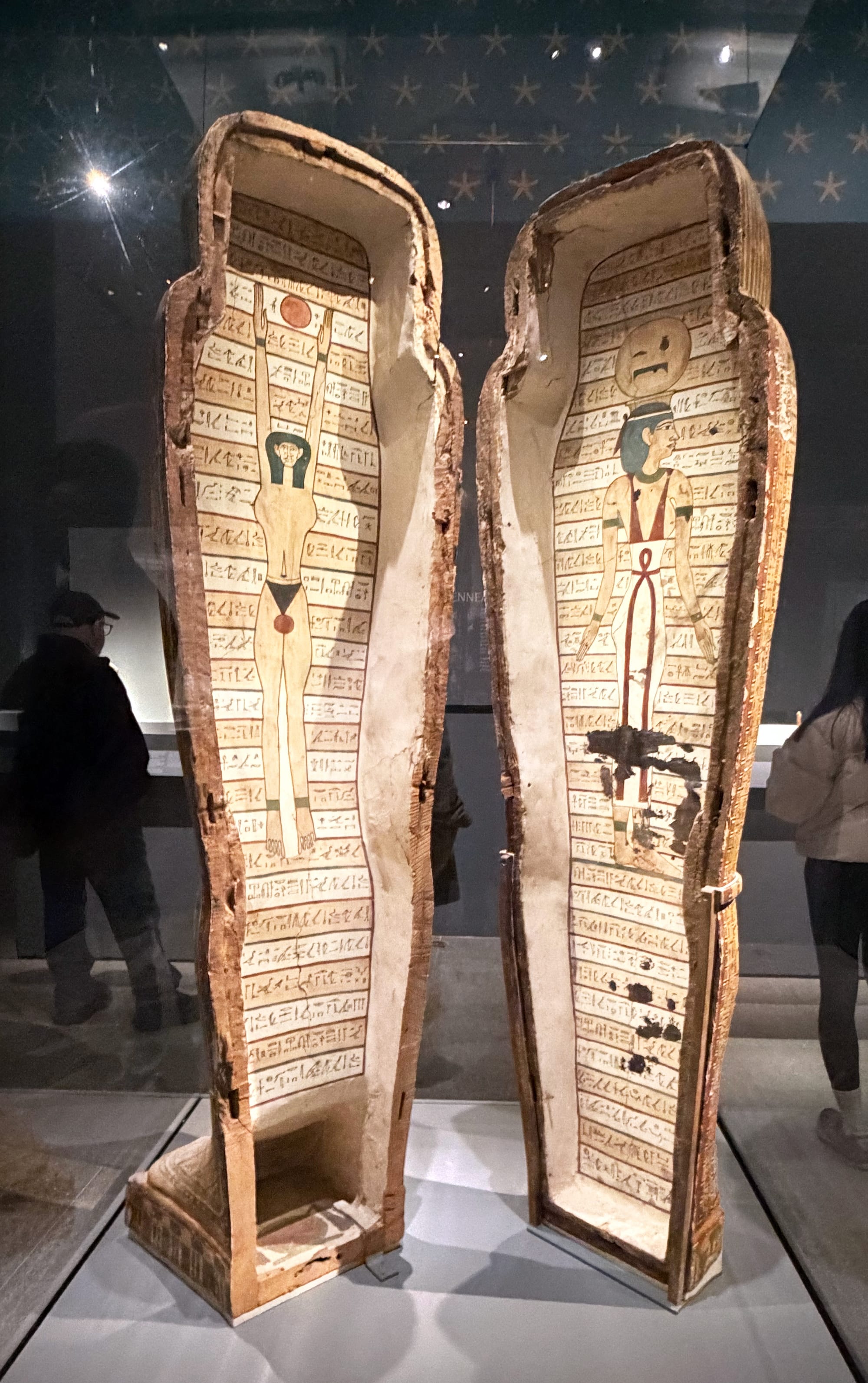 Re isn’t acting alone. In some tellings, he doesn’t just descend underground; he gets swallowed by the sky goddess Nut, who rebirths him every morning. One side gallery displays the interiors and exteriors of a well-preserved coffin, displayed vertically and encased in glass. At eye level is a naked Nut, red circles between her upraised arms and her outstretched legs, the discs depicting the sun god Re making his way through her body before dawn. Nut is associated with regeneration; she’s the tree-hugger of the group. Scholars think that a vibrant stela from around 825–712 BCE, of two men receiving water from a tree goddess, shows Nut providing sustenance to those joining in the afterlife.