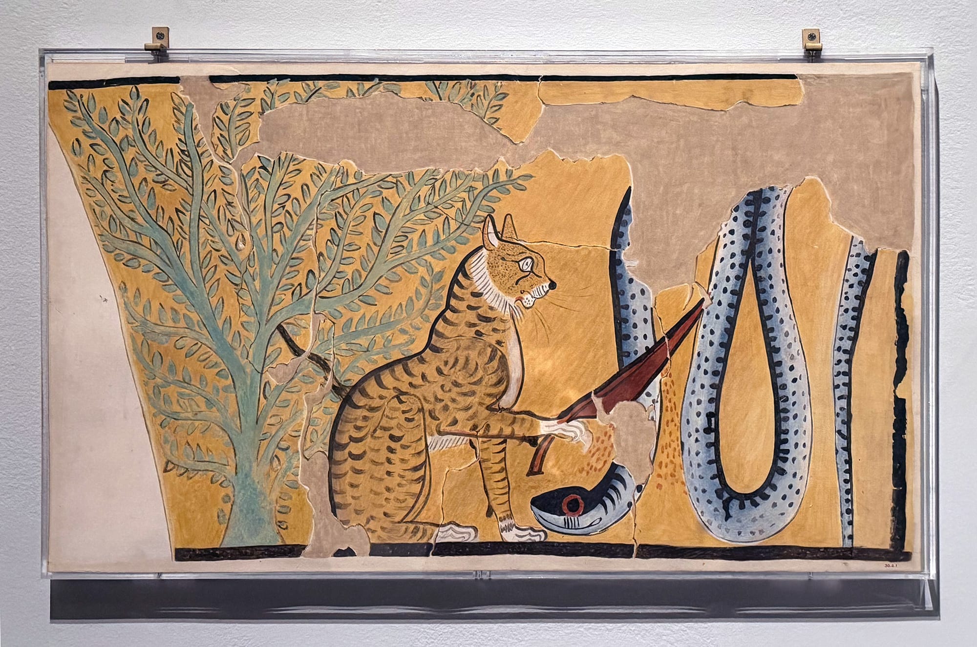 Divine Egypt dedicates a whole section to the serpents; a head recovered from a stone statue of a cobra is thought to represent Wadjet, and its abstracted obelisk shape in a sea of symbolic figuration feels eerie.