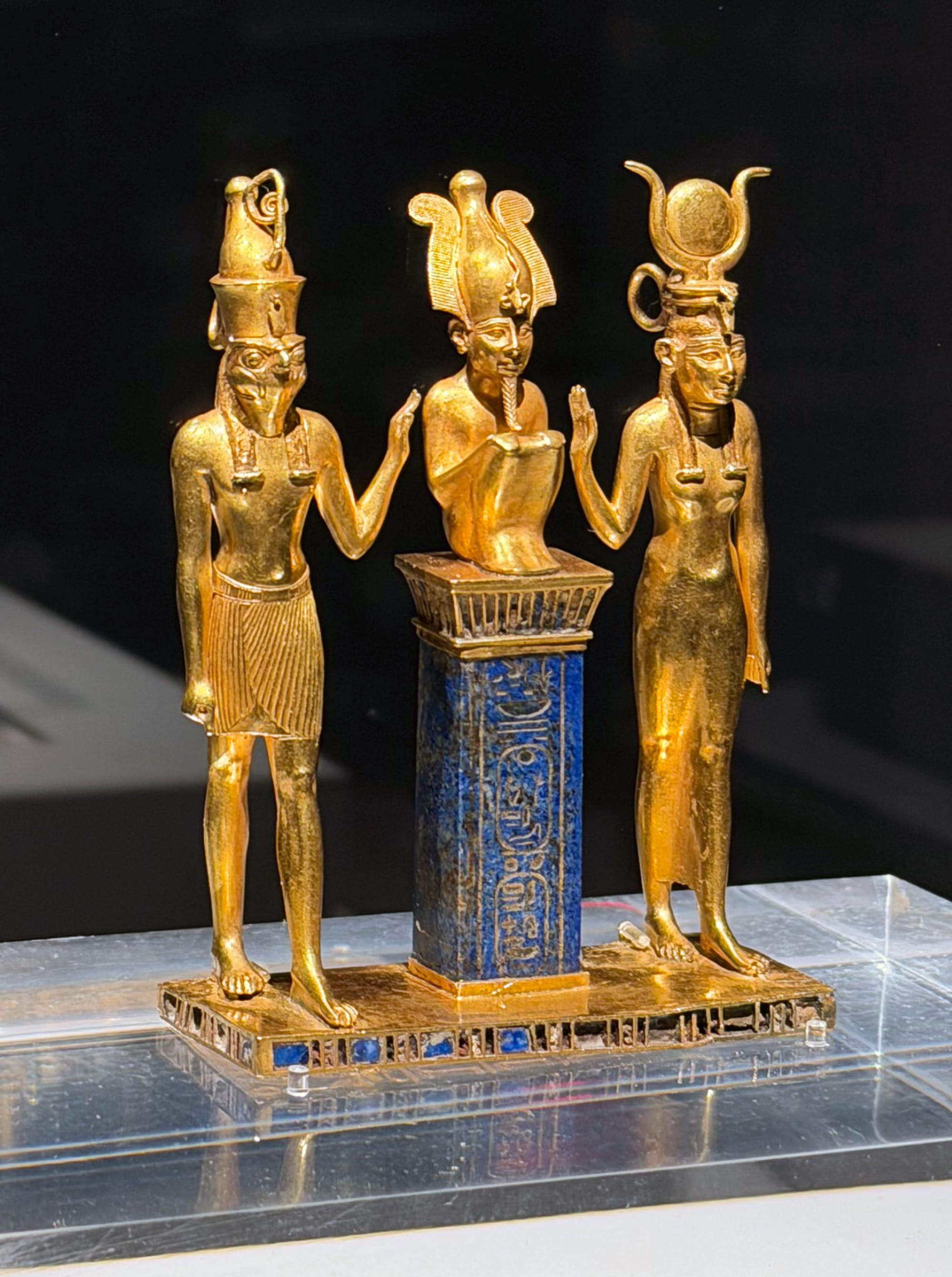 All of Nut’s children end up powerful and important to the pantheon, but perhaps none are as popular as the divine mother and goddess of magic, Isis. She’s integrated into people’s daily lives, part of the later generation of gods who function as models of power within society and who, like mortals, wish to overcome their fates. Together with Osiris, who is her brother and her husband (yes, the Greeks have Oedipus and the Egyptians have twins who fell in love in the womb) and their miraculously conceived child, Horus, they comprise arguably the most common grouping of gods. The show ends with a small, solid gold triad in which the parents flank their son atop a lapis lazuli pedestal. Under an intense spotlight, it’s one of the shiniest and most striking objects in the show.