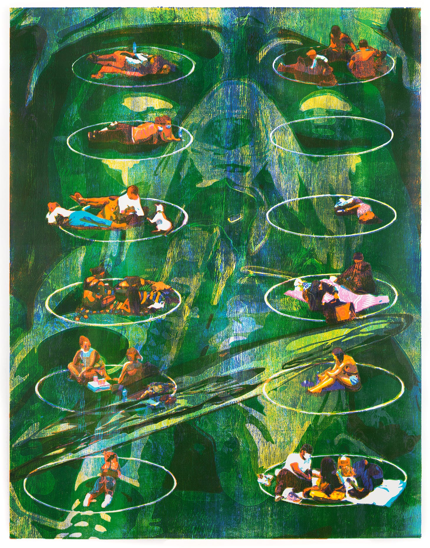 Swainston and Sidhu have been collaborating with each other for four years, constantly experimenting, sometimes failing, in their efforts to adapt certain digital technologies to their preferred medium. With Doomscrolling they have succeeded in the meld — most strikingly in regard to color, as they digitally mapped ahead of time the effects of superimposed hues, yet ultimately relied on a more traditional process of repeatedly test-proofing, adjusting saturation within a limited palette of reds, yellows, and blues. (There is no black at all, i.e., no determinant key block.) The quality of color changes from one print to the next; in one, the blue might be that of a cloudless sky and in the next, the cold light of an IC unit; red, the blood of a martyr or the glimmering hues of a computer screen during the night watch of a doomscroller. Yellow migrates through as flames, sunflower petals, a Proud Boys mask. One peers closely at the deep greens of the lawn in Central Park, ringed with white circles in which families picnic within a safe distance of each other; yet that solid green becomes unstable, as a giant ventilator mask and tubes subtly materialize within it to menace the innocent. Also present in this particular print, “July 19,” is the famous anamorphic skull from Hans Holbein’s "The Ambassadors" (1533), then as now a reminder of the fleeting nature of all life.