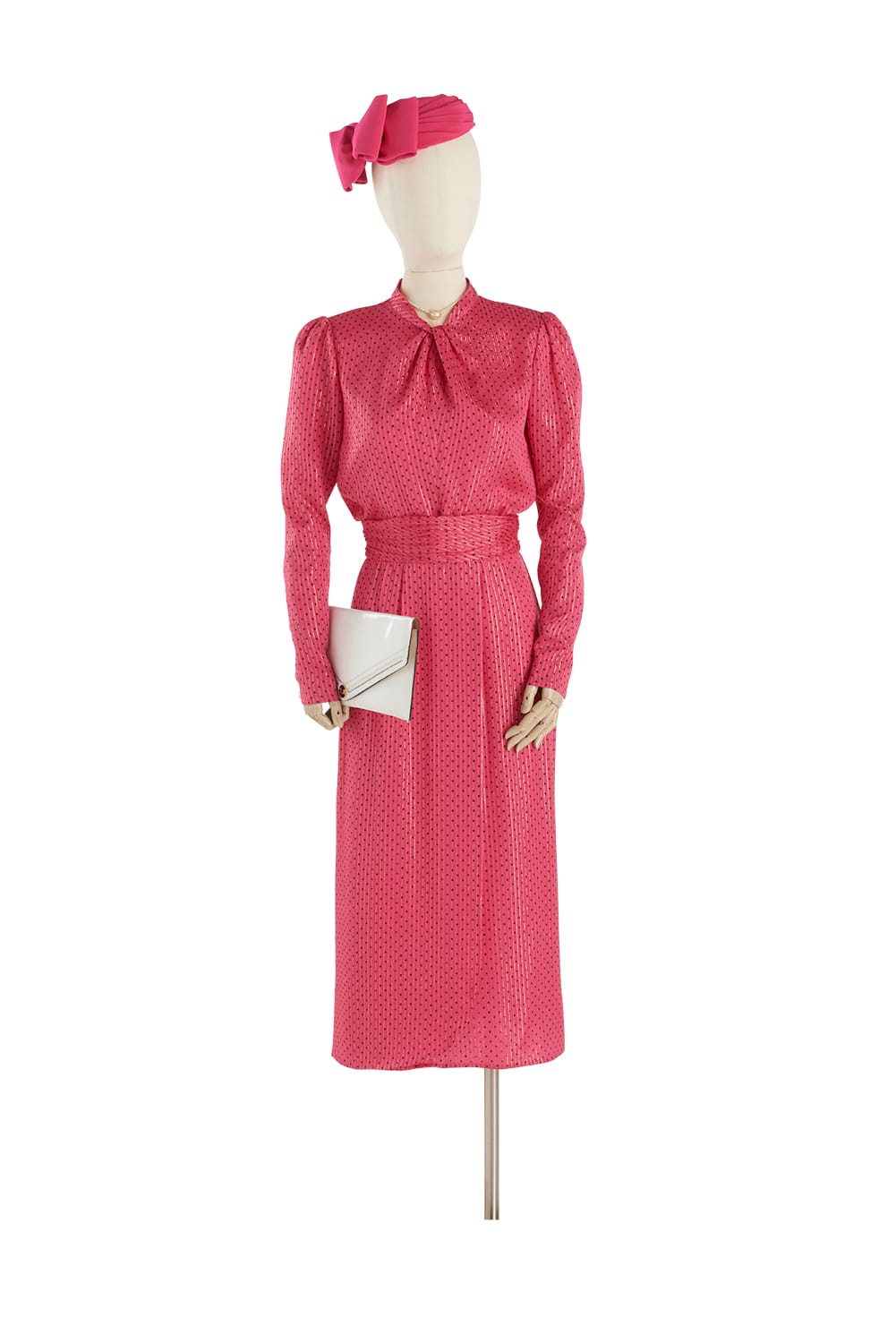 A drape neck dress with fuchsia silk and gold thread and a matching bow-accented hat, worn by Princess Diana in episode 6 of The Crown Season 4 while visiting Australia in 1983, is another highlight. The outfit was particularly tricky to put together: the team had to source vintage silks from the 1980s, many of which have been phased out in the present day, and dye existing fabrics to achieve the historically authentic look.