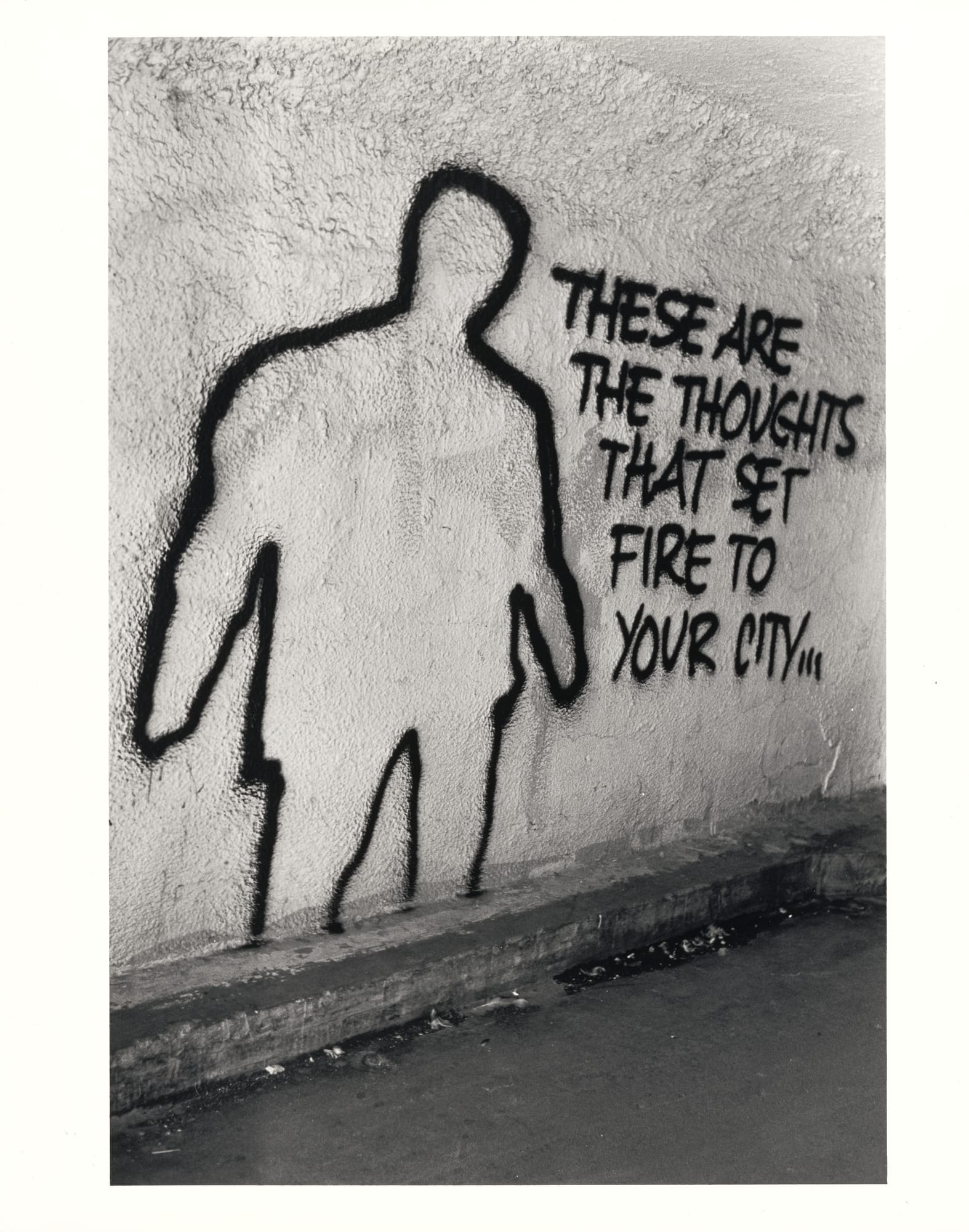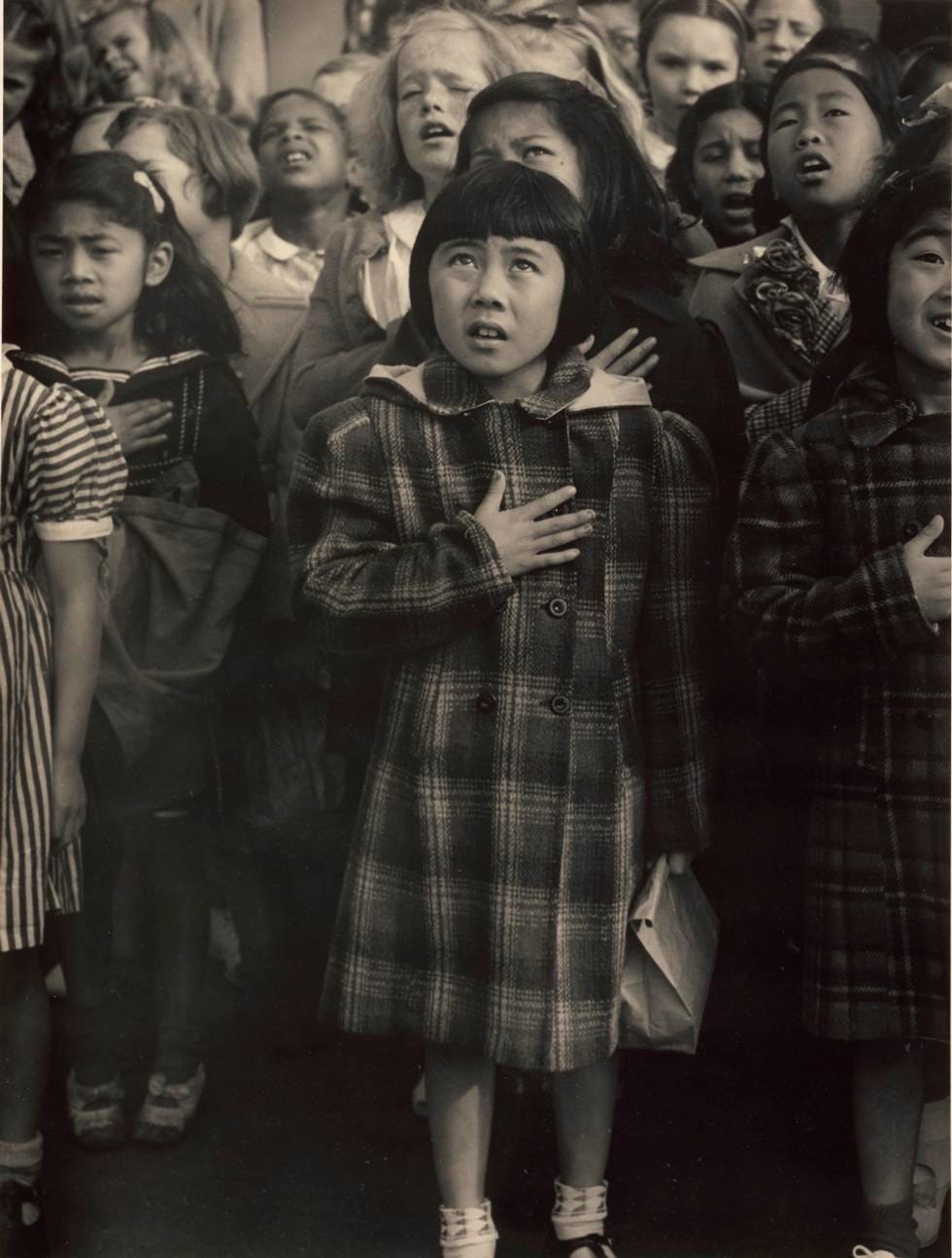 The show opens with Dorothea Lange’s 1942 photo of a Japanese American girl and her classmates saying the Pledge of Allegiance; an accompanying placard explains how she and many of the children around her spent the rest of World War II interned in camps. The image of innocent patriotism is itself an implicit protest against the racist hypocrisy of Order 9066 — unlike most of the images in the show, which take protesters and rallies as their subject. Taken as part of Lange’s government assignment to document the roundup of citizens, the photo raises important questions about who is doing the documenting, and what perspectives the photographer and audience might bring to the framing of a protest. Those questions are left to linger as we shuffle on through images of flags, marches, graffiti, and statues.