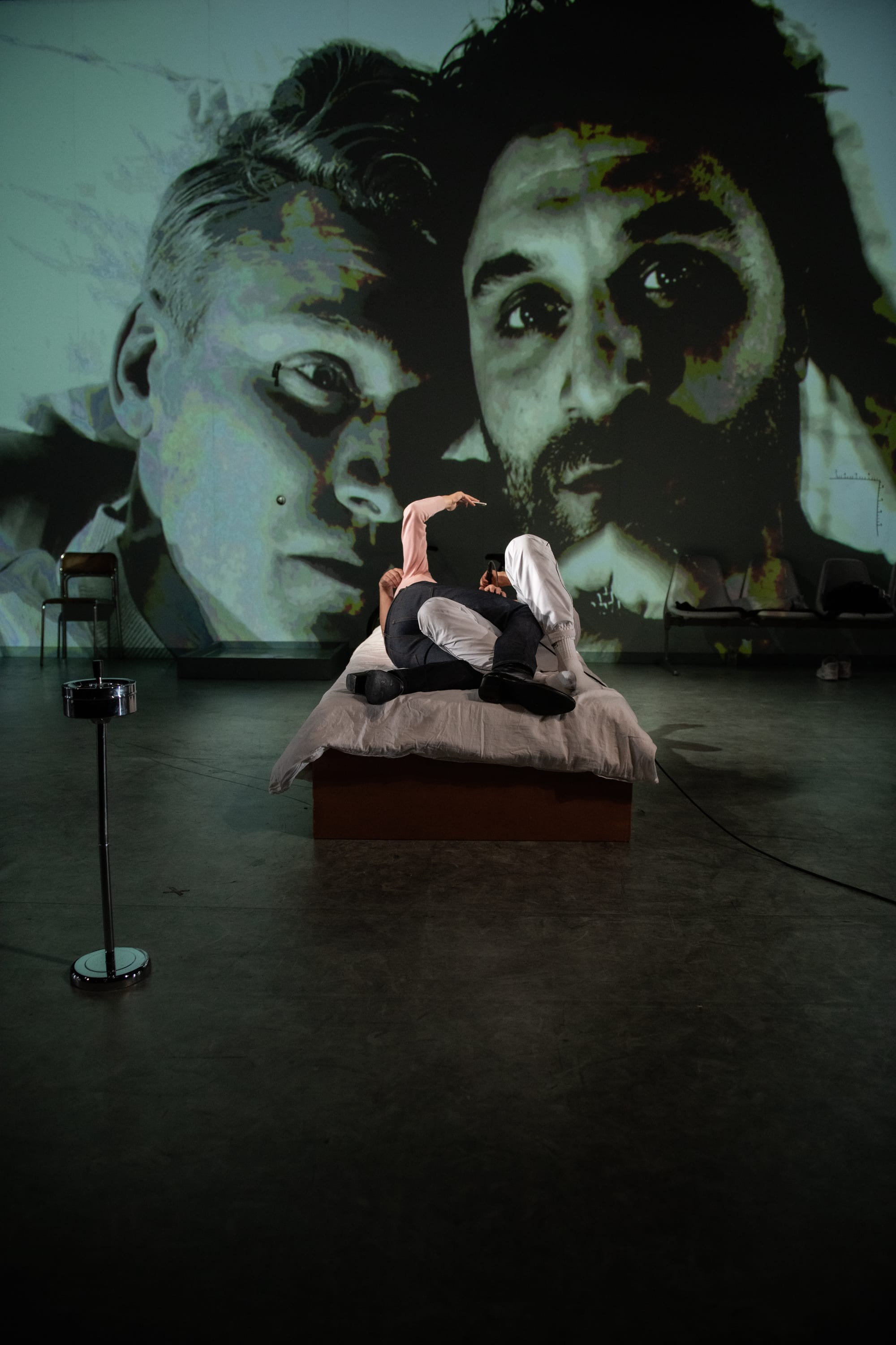 The actors use the numerous mikes arrayed about the stage to indicate subtle shifts in the text, even within a single speech transitioning from live to reproduced sound, the mike lending a creepy intimacy to the voice–closer, too close to the ear. The actors often directly address the spectators. They sometimes wear only part of a costume, more an offhand signification than an attempt at literalism. Gawenda makes no effort to conceal his healthy mustache while playing the mother in an off-kilter wig. Though the emotions and story are convincing, the style of the production eschews mimetic representation, except in the extensive use of live video projection onto the entirety of the back wall of the stage, as the actors openly film each other with cameras on tripods and cell phones.