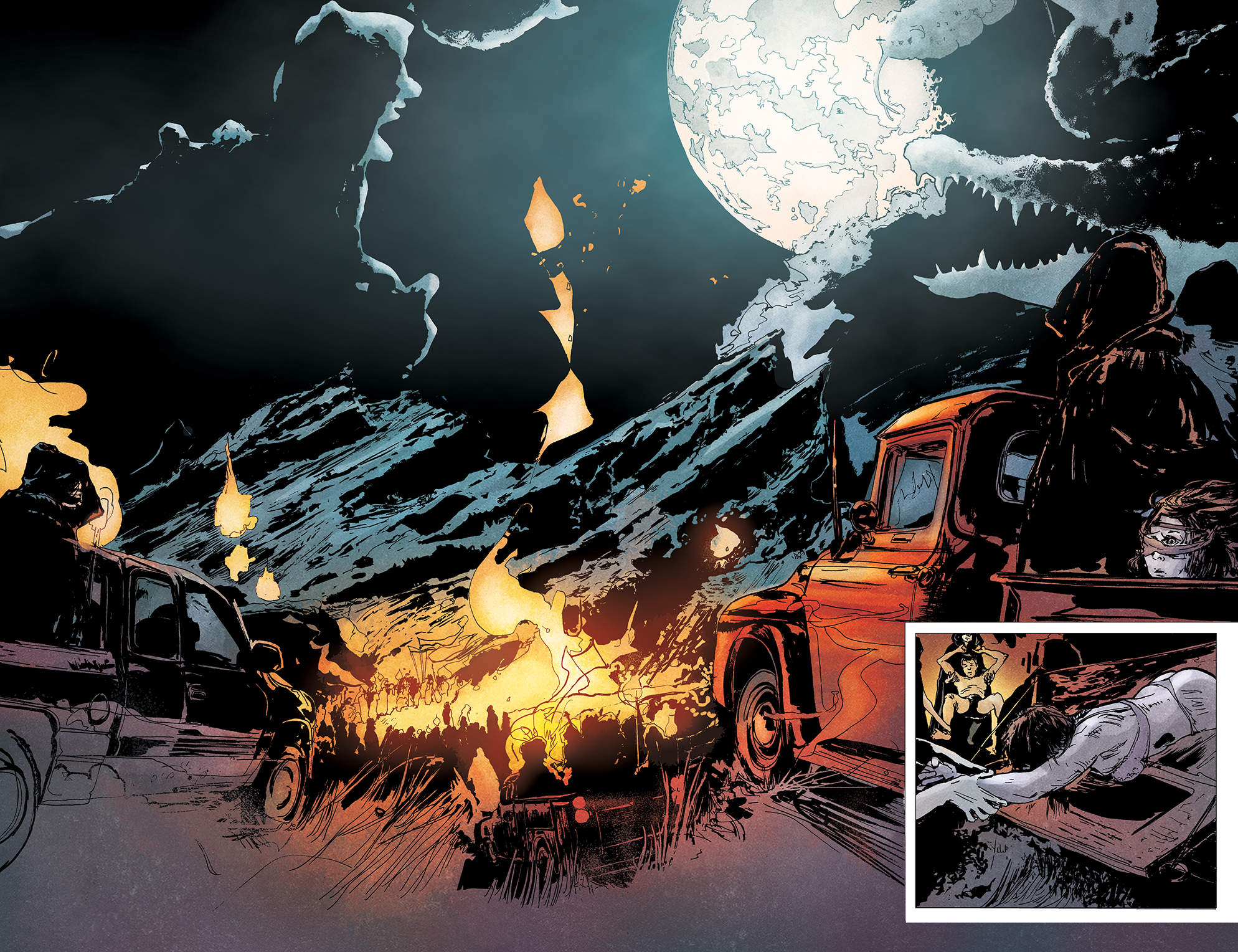 At a clearing encircled by more members of the cloaked horde, clouds take toothy serpent shapes and obscure the white of Sampson’s enormous desert moon, but nothing can dampen the menace below. The most ghastly sequence in Winnebago Graveyard #1 conjures grainy B-horror films and paper-thin stories of “satanic ritual abuse” that hyperbolic 1980s television hosts chased for ratings. Perched over the bound man now splayed out on a makeshift altar, a presumed “high priest” readies an offering. Things end as badly as expected from horror veteran Niles, whose credits include work with recently departed macabre master Bernie Wrightson and whose 30 Days of Night went to the big screen.