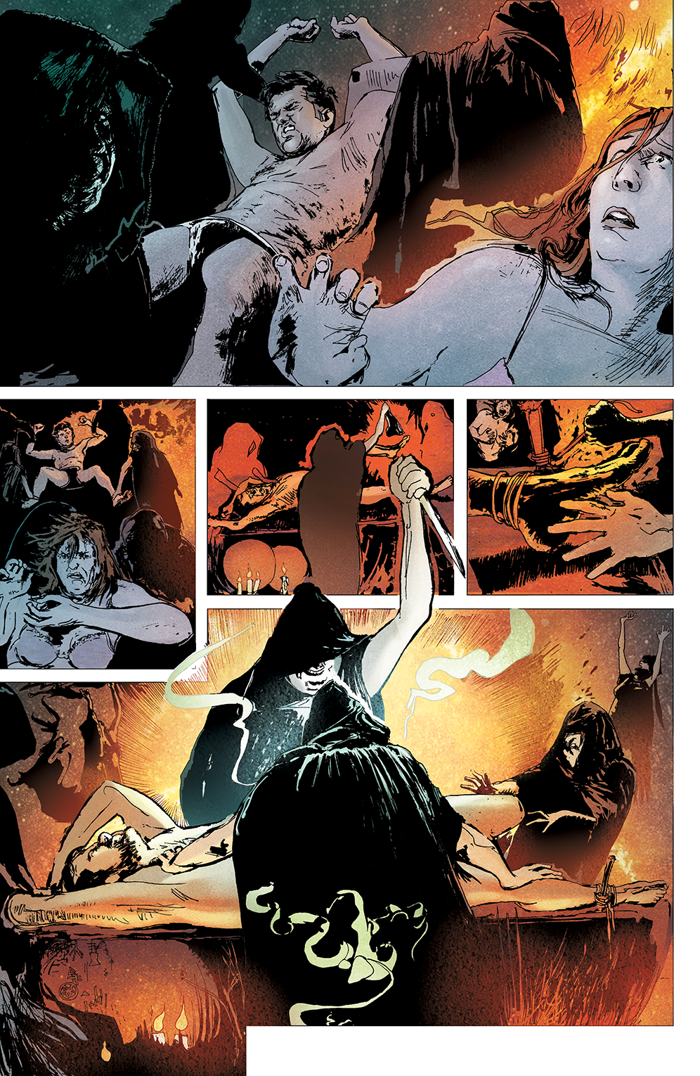 The cool blues and pastel violets that colorist Stéphane Paitreau employs for the abduction of a nearly naked couple from their motel room are soon quickly abandoned, and blazing fires and splashes of blood populate the lion’s share of Winnebago Graveyard’s pages. Sampson’s black-robed, torch-wielding mob marches its victims past an RV in the Sierra Pelona lot, then pile its bounty into pickup trucks. They barrel down mountain roads toward a valley, and hectic panels-within-panels depict the captives’ hellish ride. Soon, all is red brake lights and crackling auburn flames.